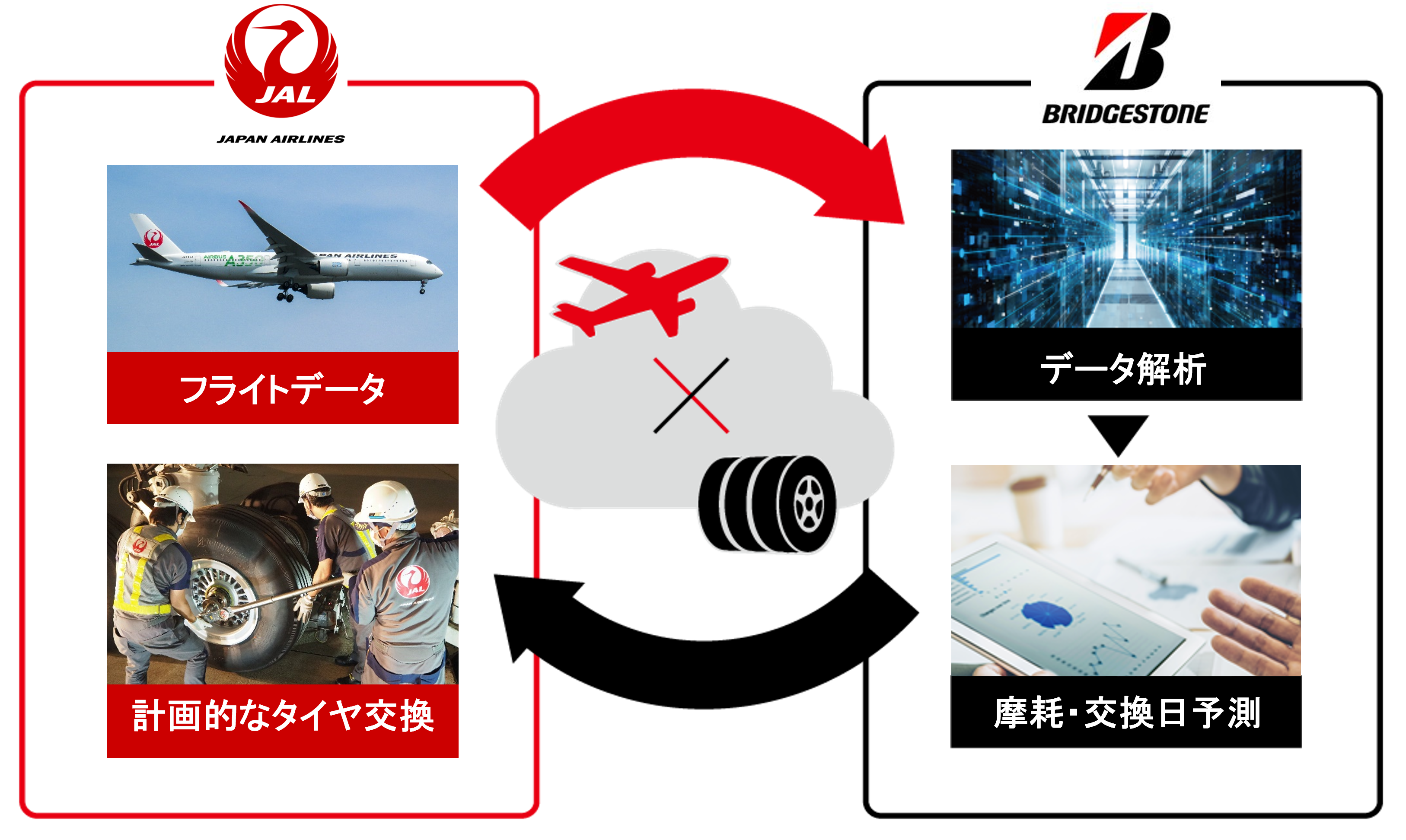 荒木さん 日本航空(JAL)様とブリヂストンとの協業で、JAL様が持つフライトデータや離着時にかかるタイヤの実摩耗データと、ブリヂストンが持つタイヤ摩耗予測技術を掛け合わせ、航空機タイヤの交換時期を予測する「航空ソリューション」は皆さんもご存じだと思います。この取り組みは、JAL様から頂いたビッグデータに、ブリヂストンが過去から積み重ねてきたナレッジ・ノウハウや独自のアルゴリズムを掛け合わせることで顧客価値に変換しています。航空機用タイヤの摩耗・耐久予測を行うことで、タイヤやホイールの在庫平準化・削減、タイヤ交換業務の効率化によるJAL様のオペレーションの生産性最大化に貢献する取り組みです。