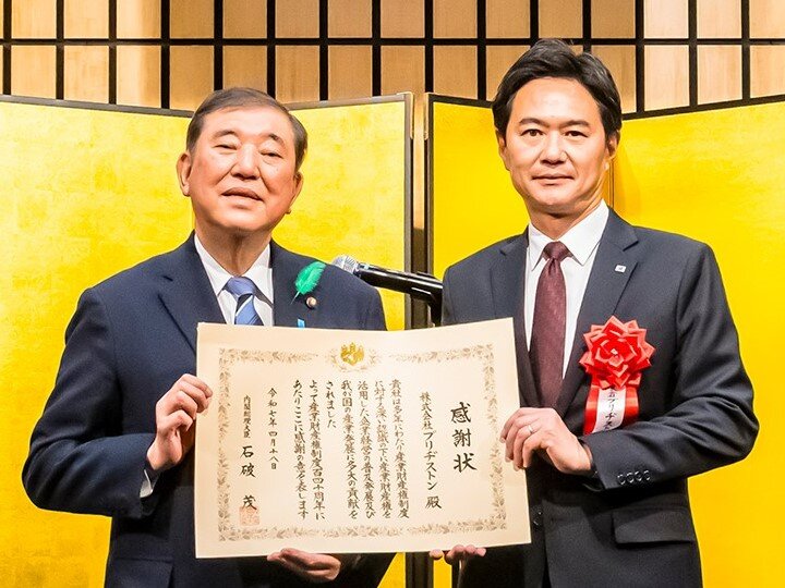 今年4月、産業財産権制度への普及・発展への貢献が評価され、内閣総理大臣の石破 茂さんから(株)ブリヂストン 代表執行役 副社長 Global CAO(Chief Administration Officer)・Global CSO(Chief Strategy Officer)の森田 泰博さんに「産業財産権制度普及発展特別功労企業 内閣総理大臣感謝状」が授与されました。