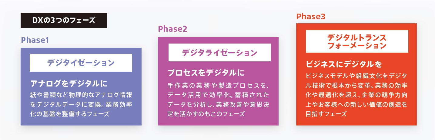 ※2 一般的にフェーズ1が「デジタイゼーション(Digitization)」、フェーズ2が「デジタライゼーション(Digitalization)」、フェーズ3が「デジタルトランスフォーメーション(Digital Transformation, DX)」と言われている