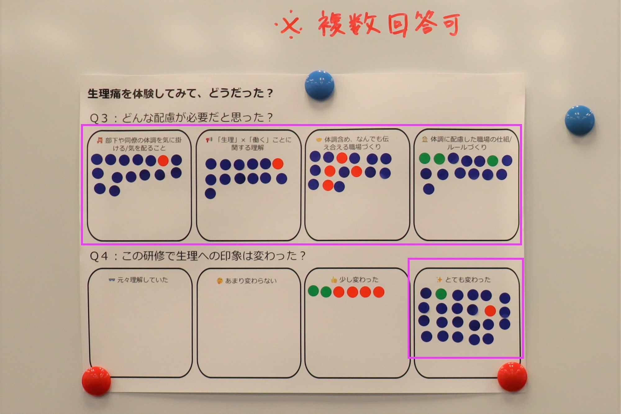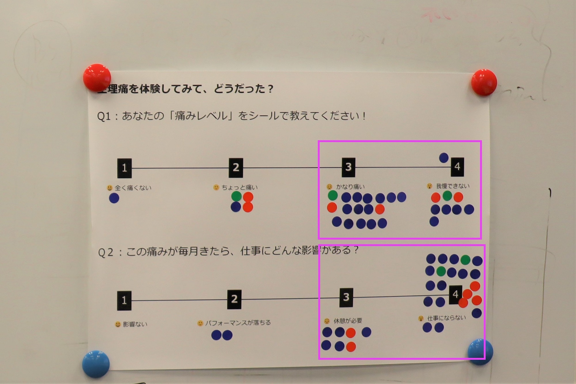 最後に「痛みのレベルは?」「仕事にどんな影響がある?」「どんな配慮が必要?」「生理への印象は変わった?」といった質問に、自分がどう感じたか、シールを貼って回答してもらったよ。
