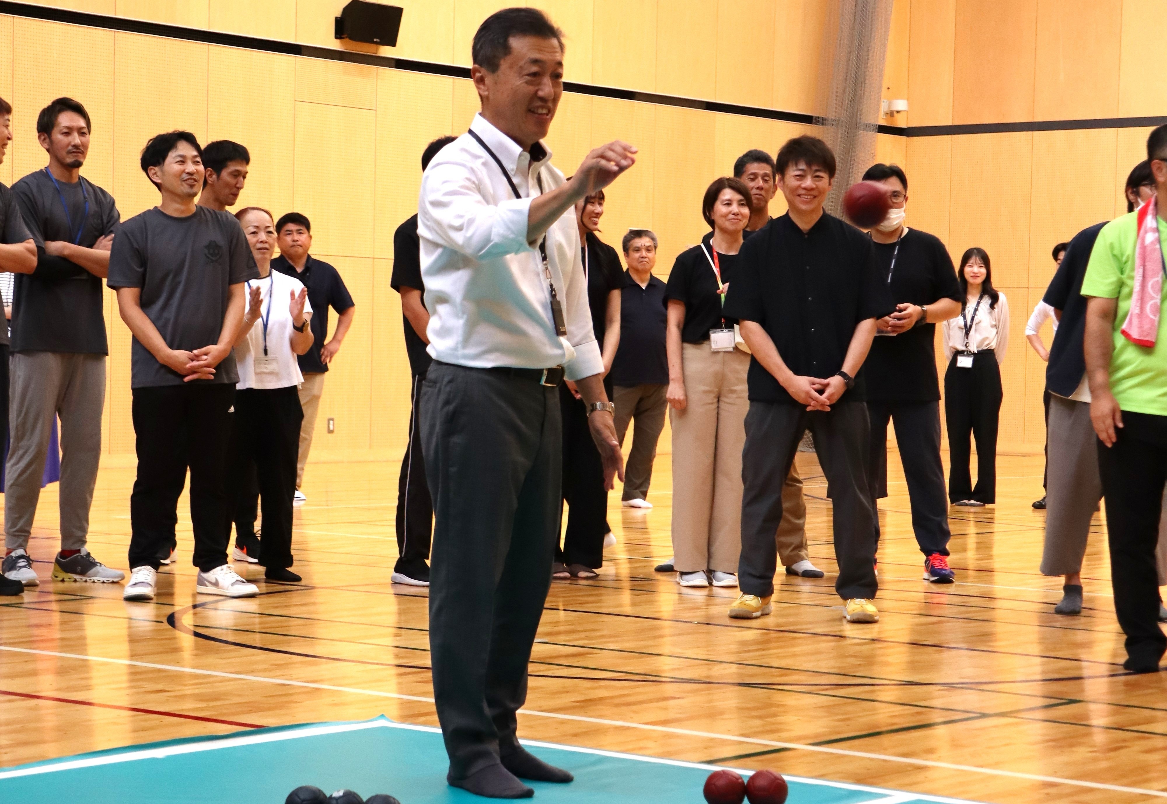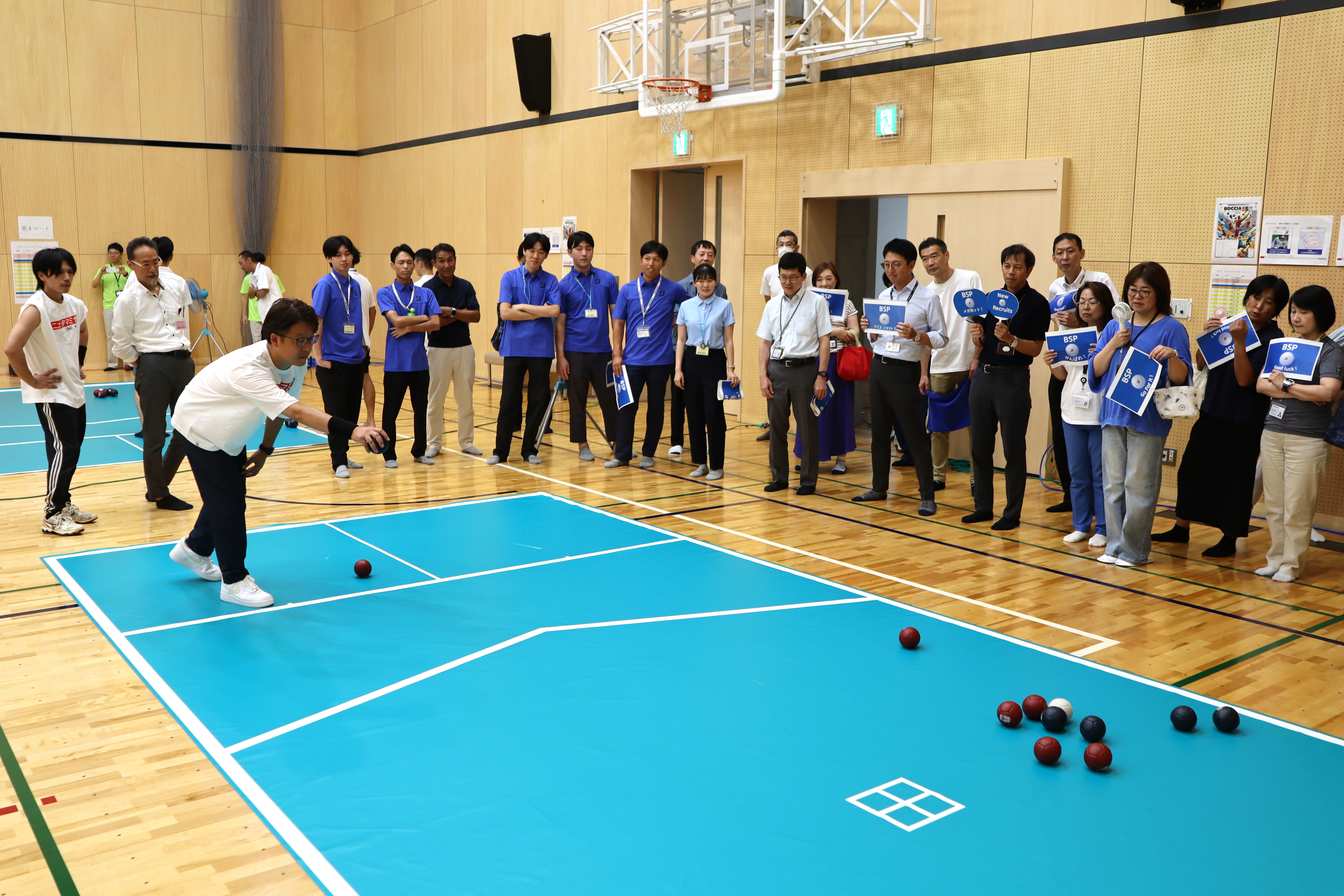 まずは、(株)ブリヂストン 常務役員 BSDP 化工品・多角化・探索事業管掌常務役員の原島さんが、「ボッチャを通して、仕事以外の会話をすることで、よりまとまりが生まれることを期待しています」と開会挨拶。チーム競技で一体感を高めます。