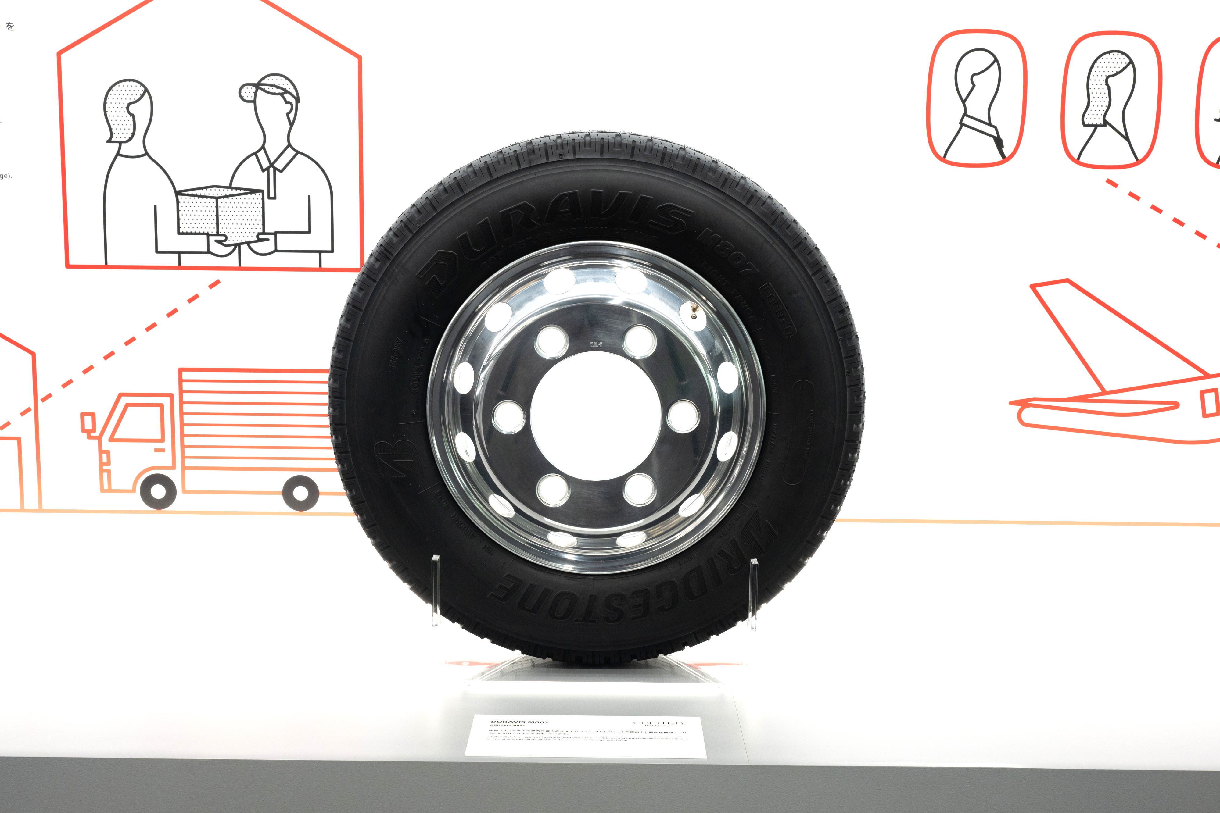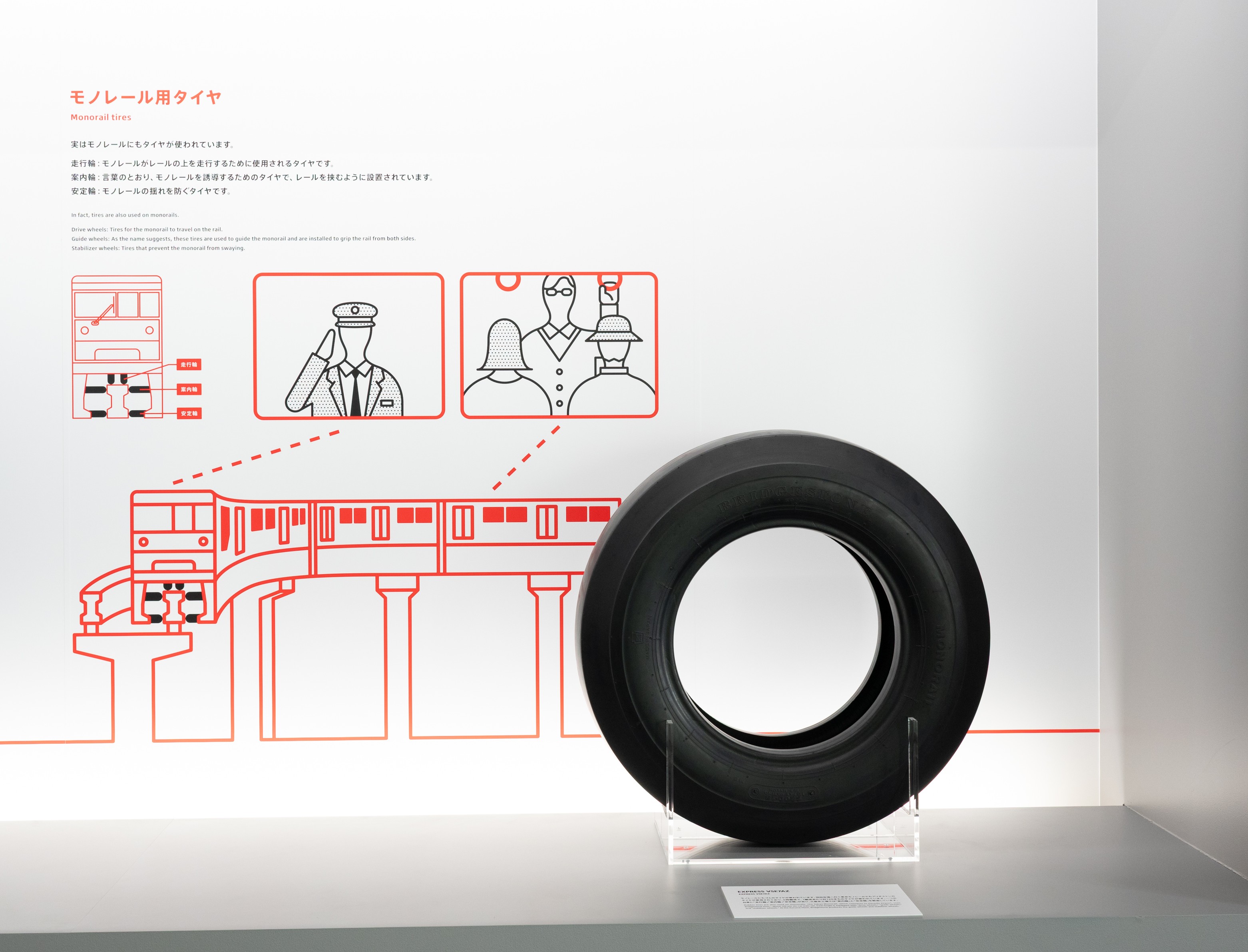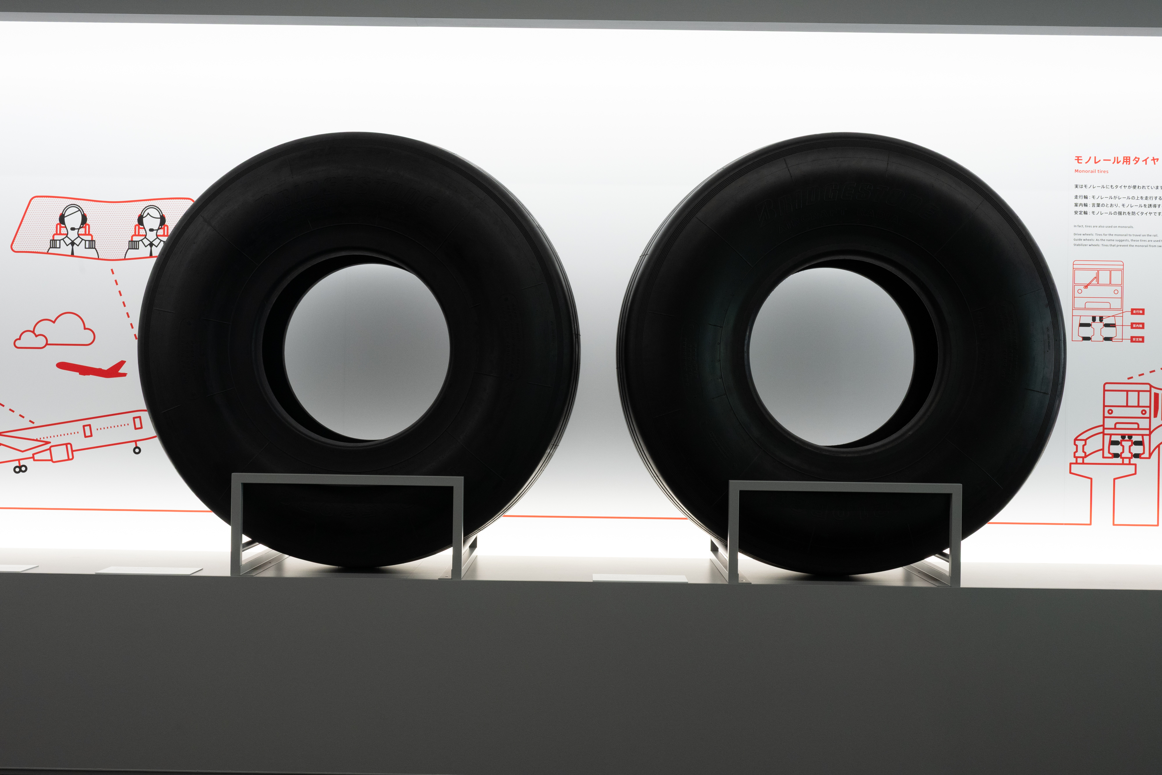 久留米工場で製造している、乗用車用タイヤ、商用車・小型トラックタイヤ、航空機用タイヤ、モノレールタイヤを実物と共に、装着している車両や使用シーンとあわせて展示しています。