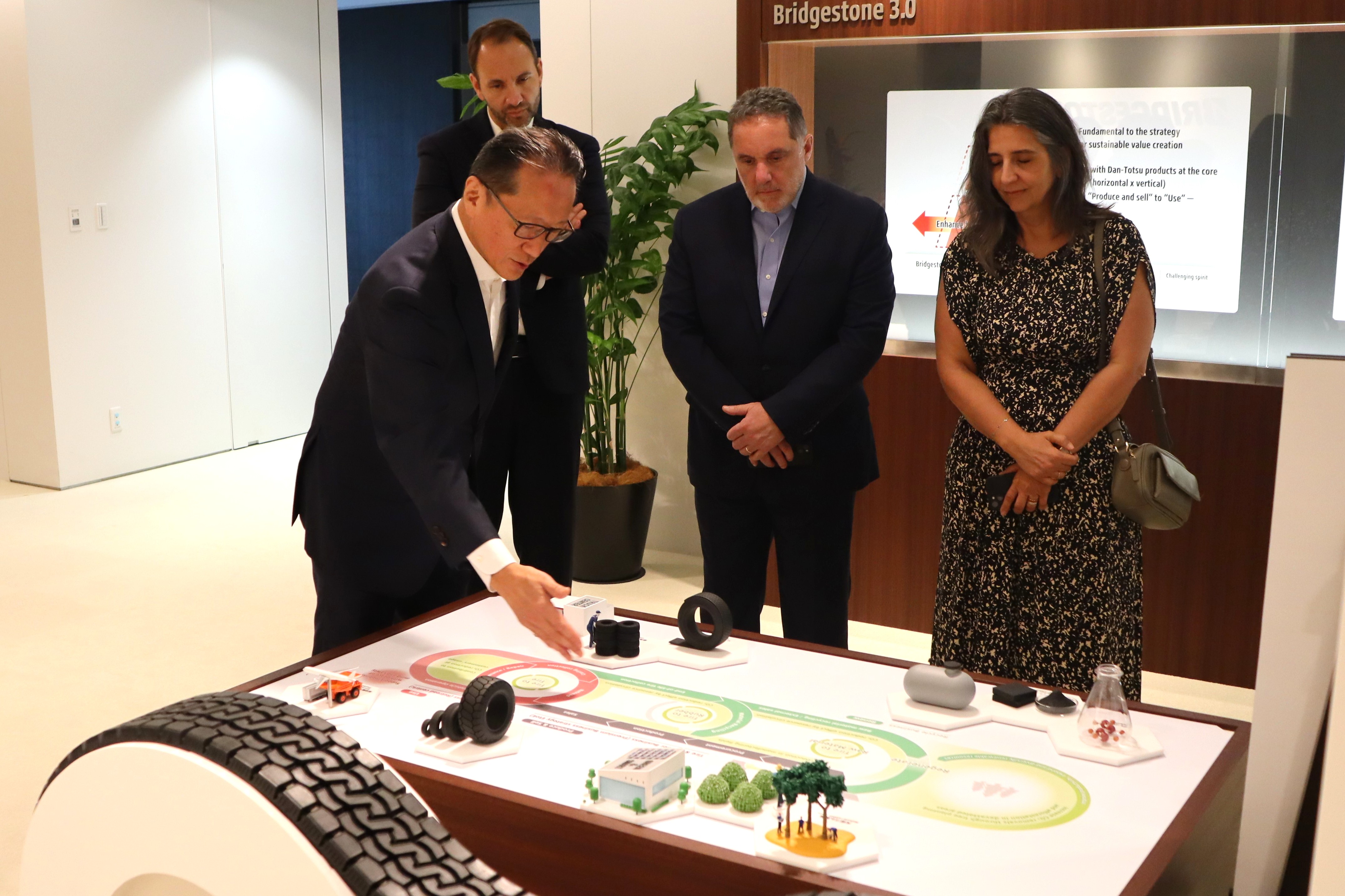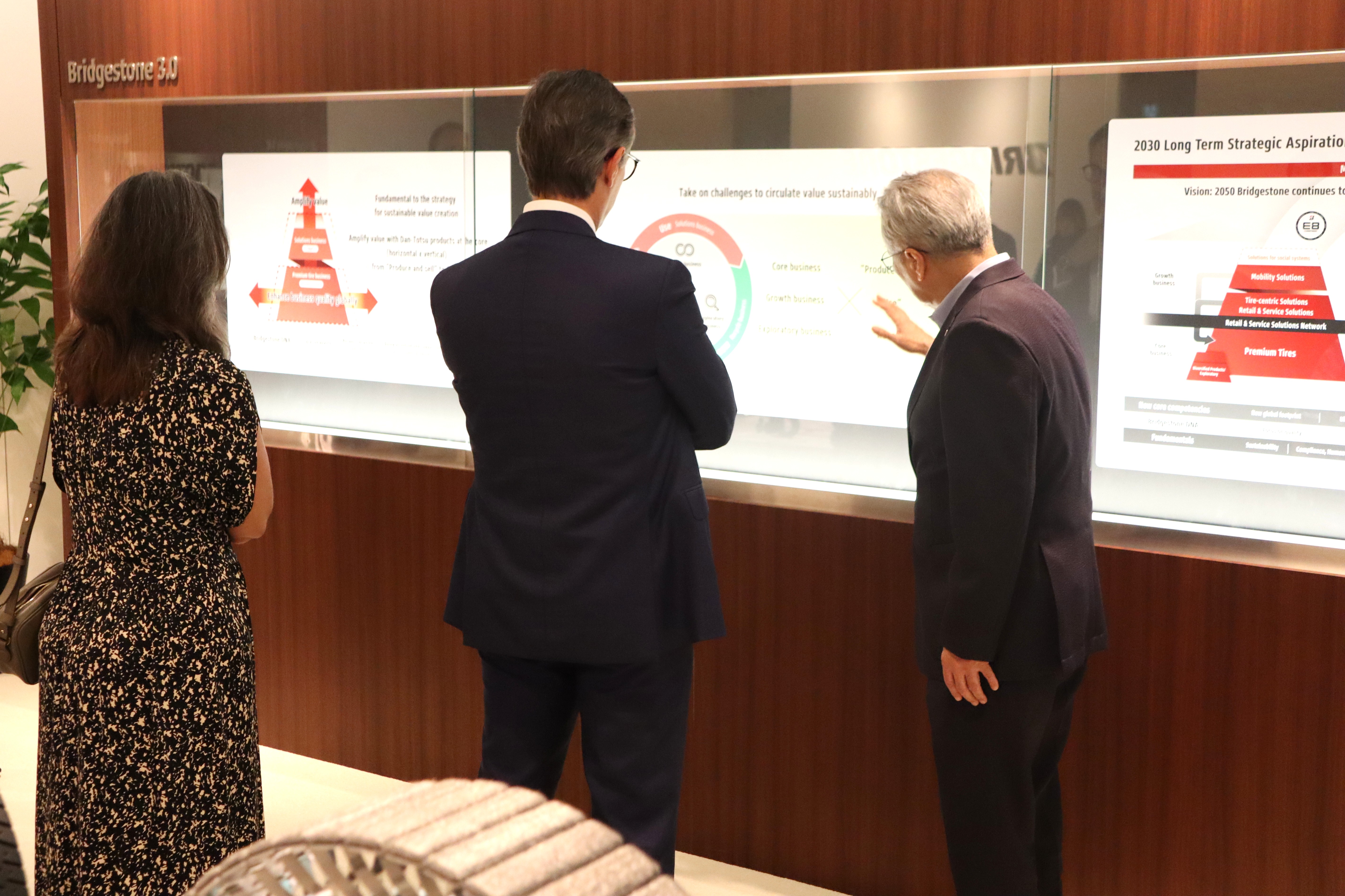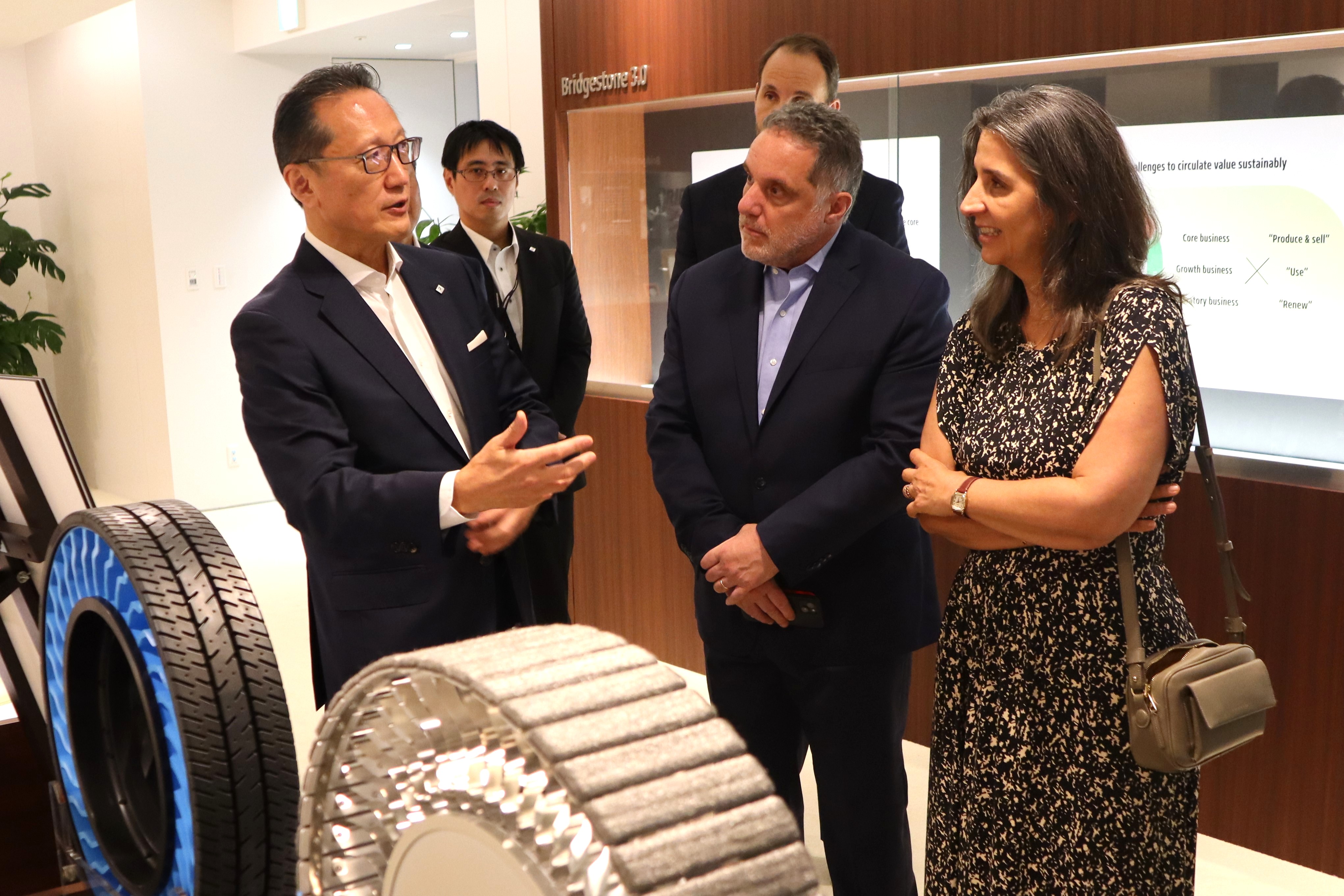 ピメンタCEOをお出迎えした石橋さん、田村さんは、ブリヂストンの歴史や企業理念、「Bridgestone E8 Commitment」、サステナビリティに関する取り組みについて、展示物をお見せしながらご紹介しました。自社の取り組みの参考にするため、熱心に写真撮影する方もいるなど、ご来訪された皆さんはとても興味深くお話を聞いていました。