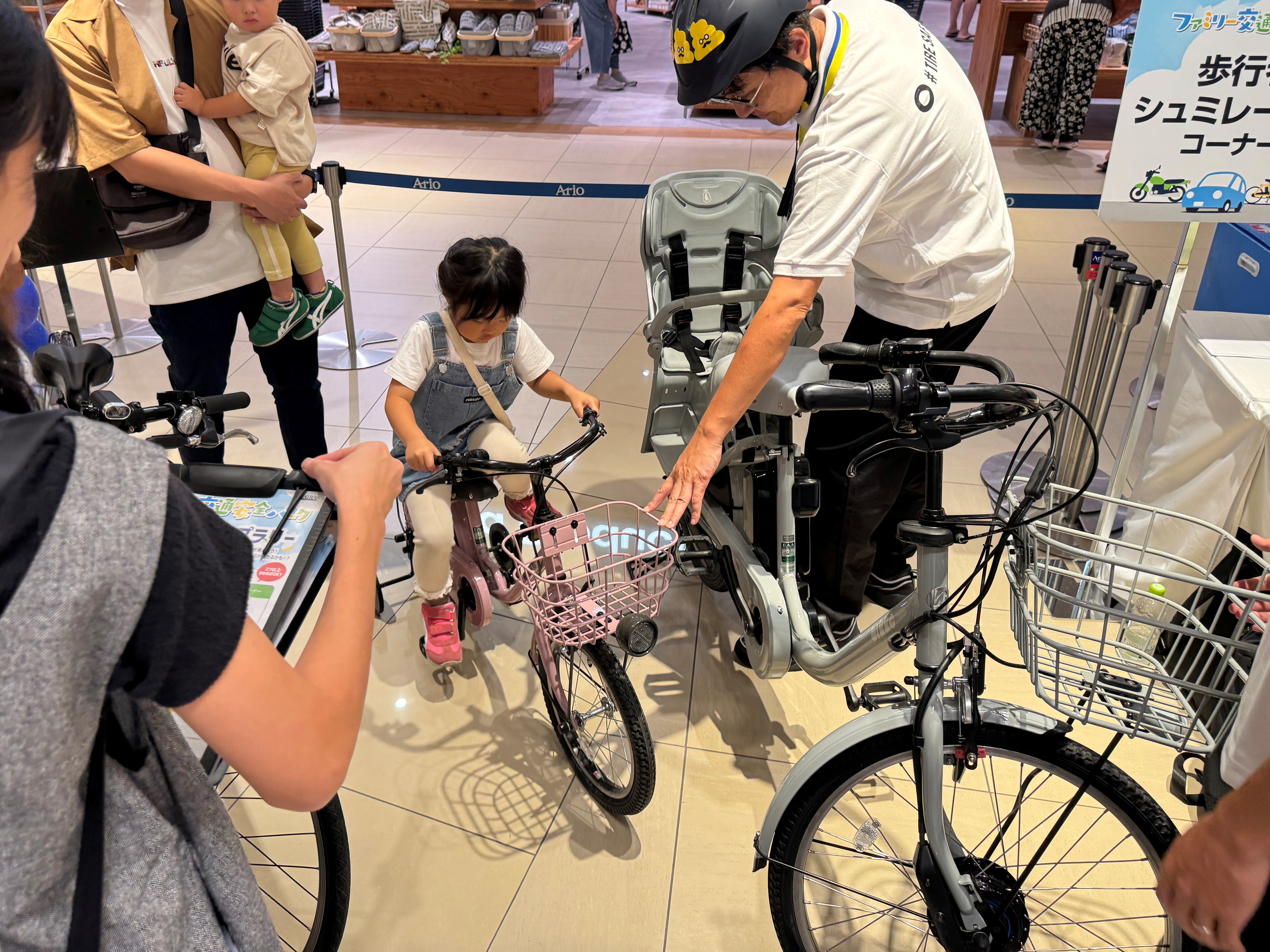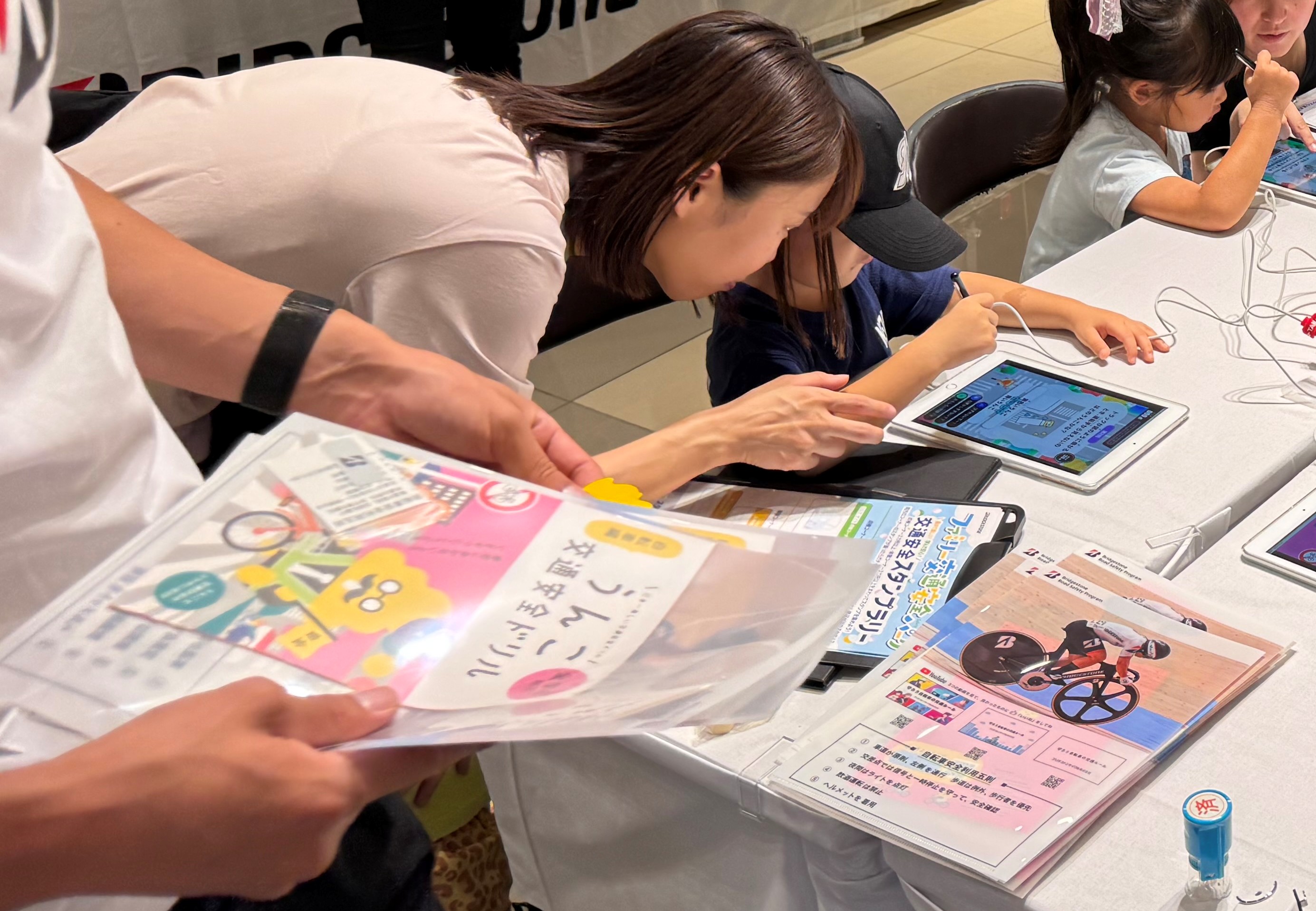自転車コーナーでは、前回に引き続き空気入れ体験や、ヘルメット・ライトなどの安全アイテム紹介、「うんこ交通安全ドリル」のコーナーを設置。普段から自分用の自転車に乗っているためか、スタッフの説明を真剣に聞き入っているお子さんの様子も見られました。