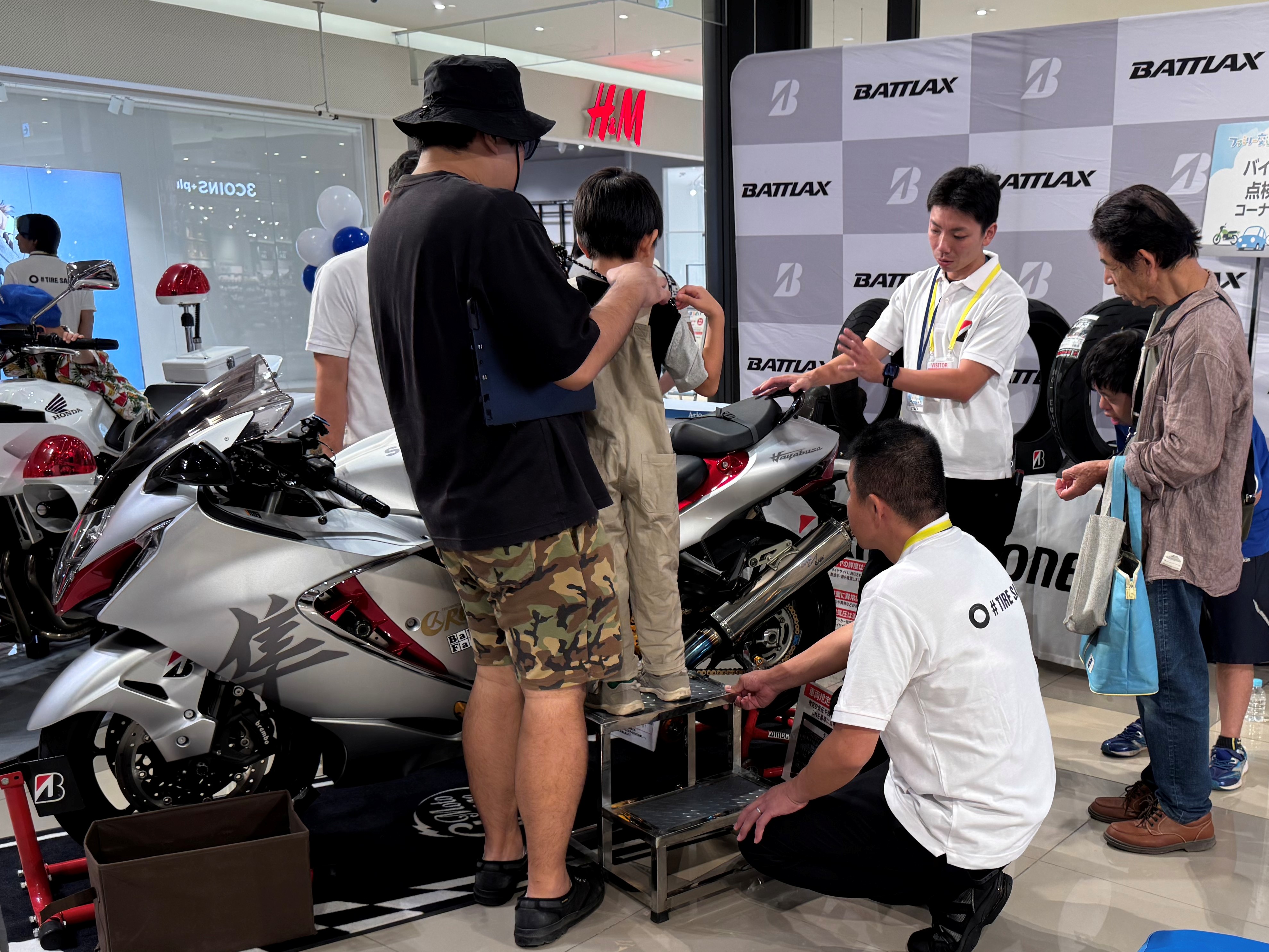 二輪コーナーでは、千葉県警察の白バイやポケバイの跨り体験が大人気。バイクをきっかけに、二輪車用タイヤやその点検にも興味を持っていただくきっかけになりました。また、お子さんだけでなく、バイクの知識が豊富なBTSJスタッフと会話を楽しんでいるライダーの姿も。