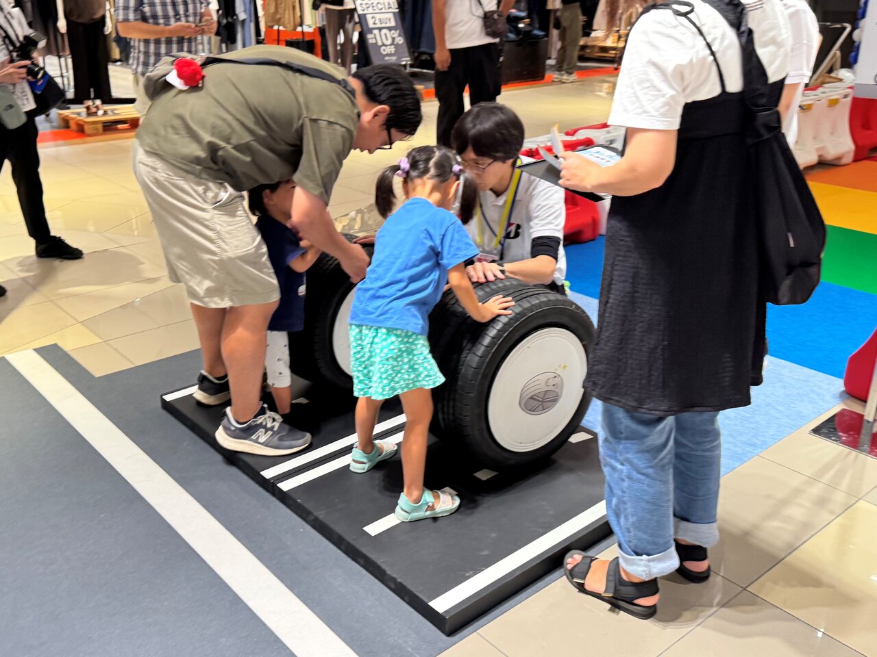 体験コンテンツの中で、小さなお子さんを中心に特に人気だったのが「タイヤゴロゴロ」。適正な空気圧と、空気圧不足の2種類のタイヤを転がし、その距離の違いを比べます。空気圧不足のタイヤは途中で止まってしまうのに対し、適正な空気圧のタイヤは長い距離を転がっていくため、空気圧の違いが転がり方に影響することを実感いただくことができました。