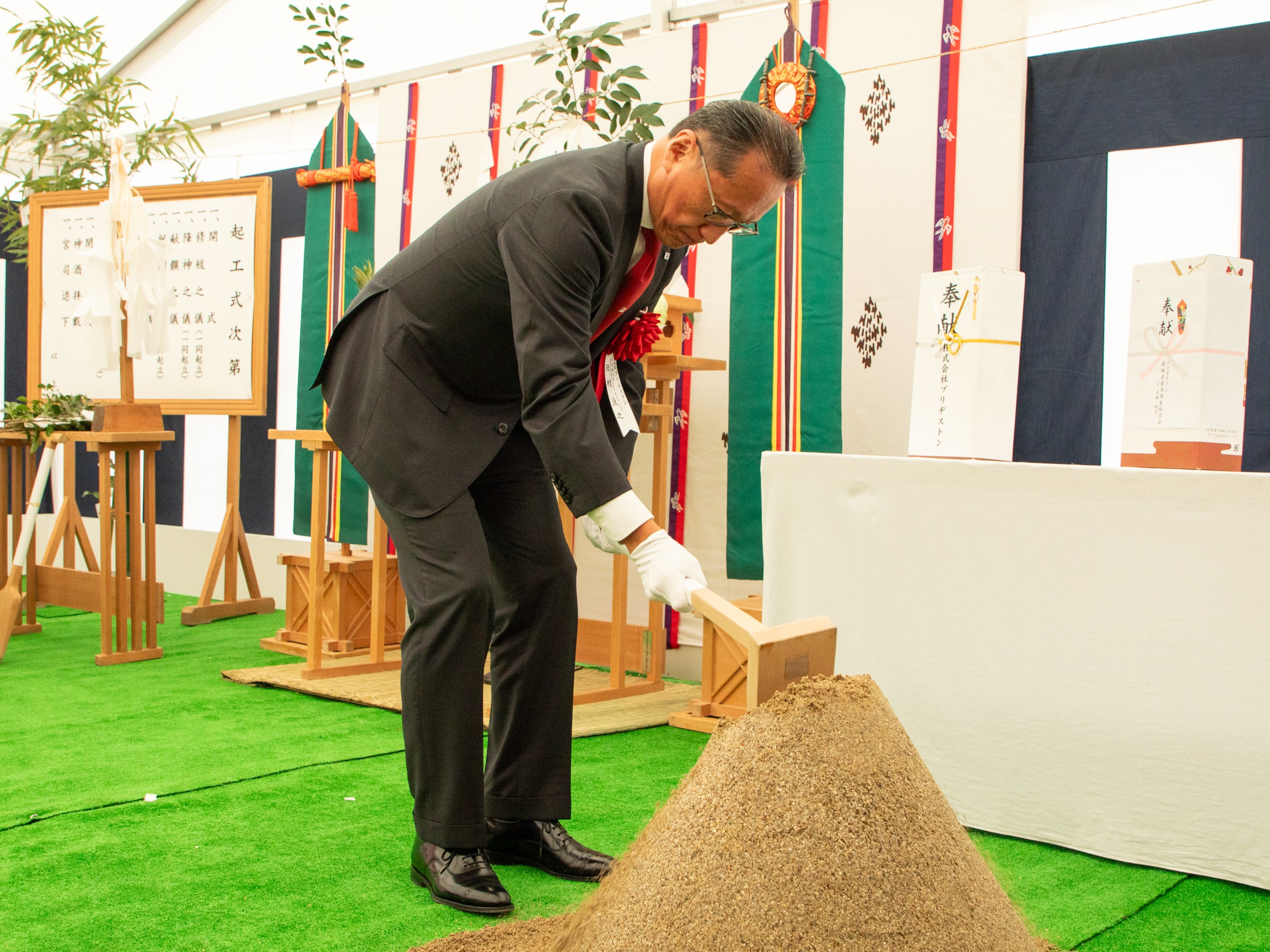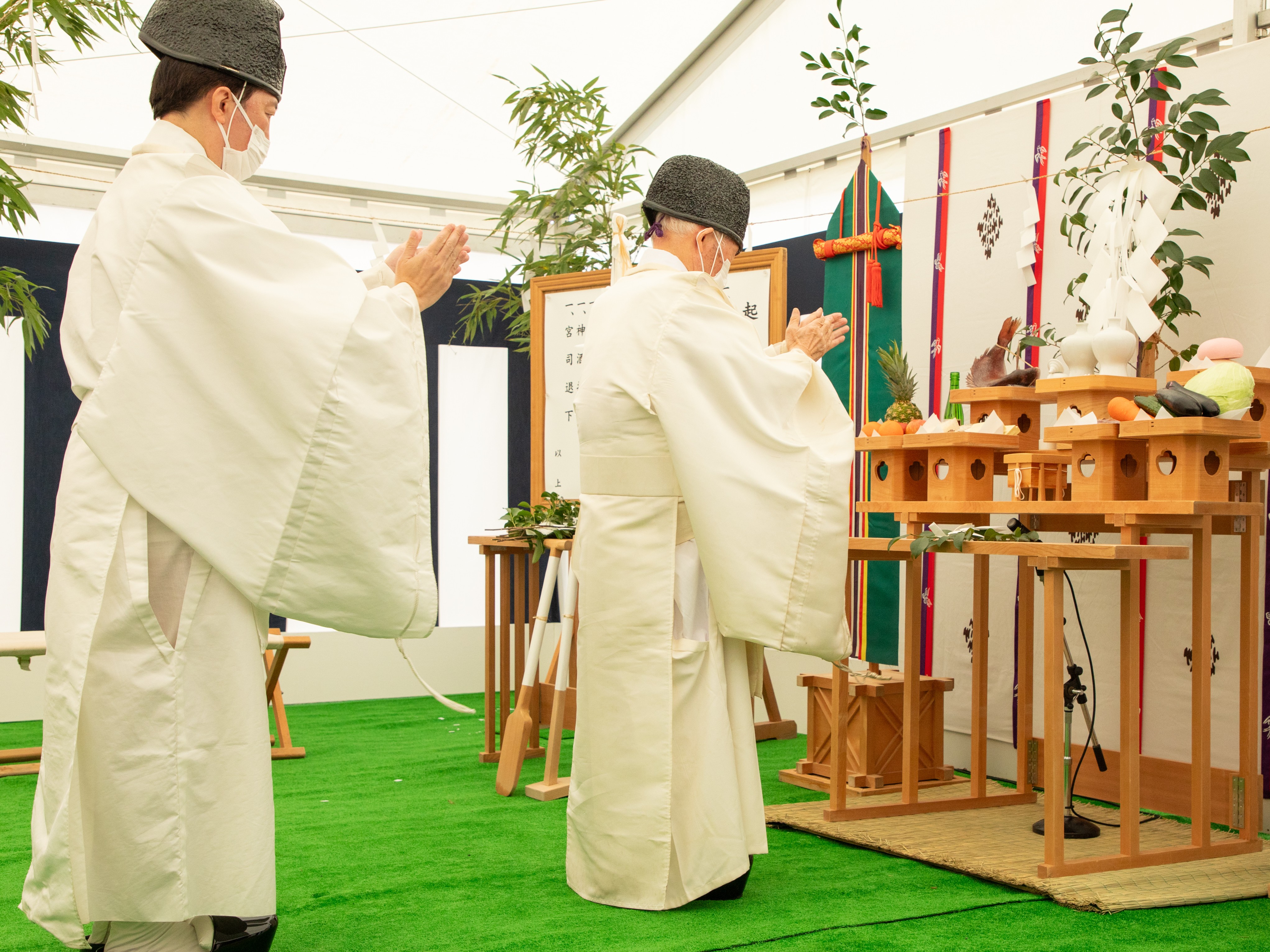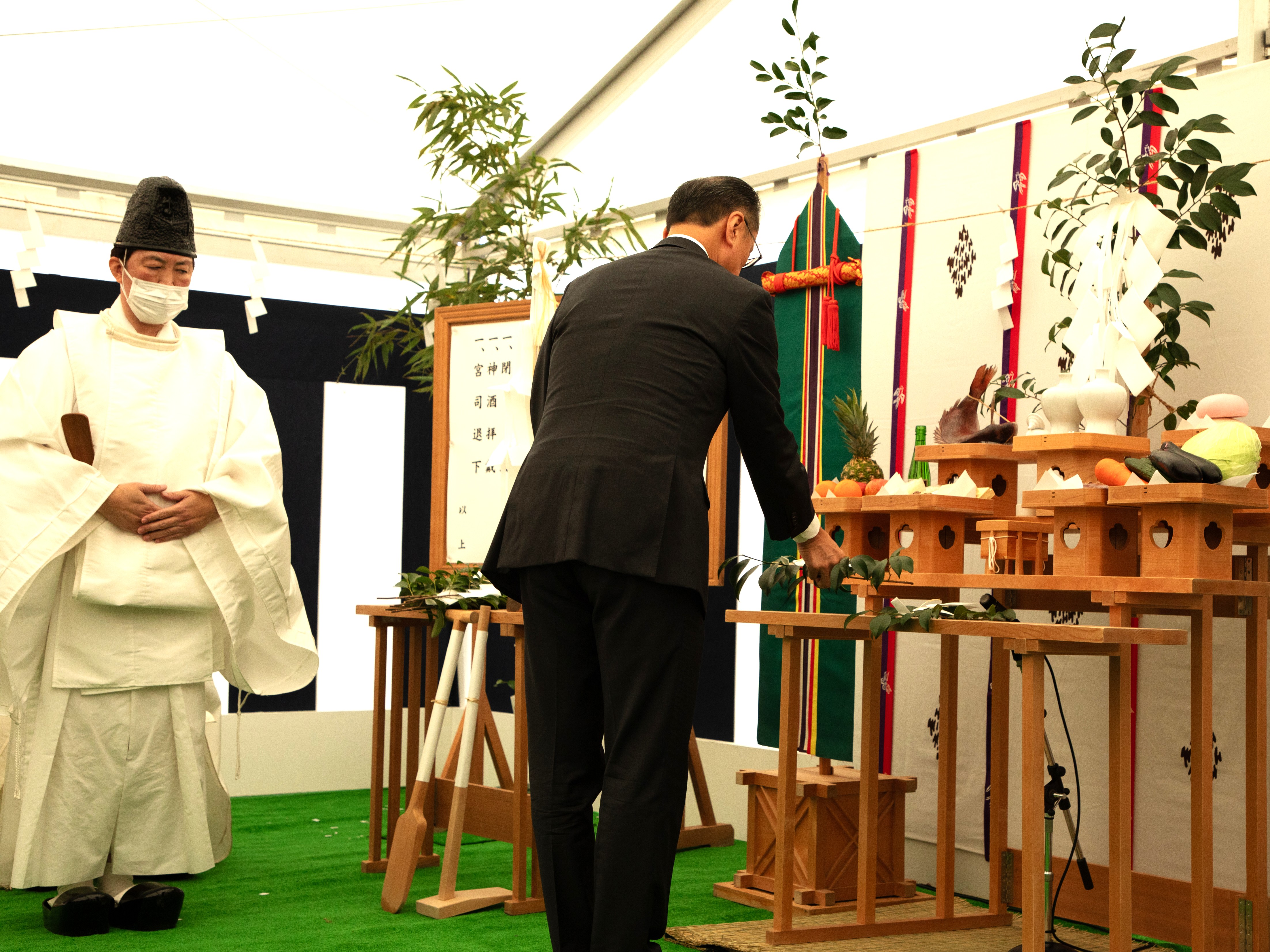 起工式とは、工事を始める前に施工主が神主を招き、土地、建物、地元の神様に工事の安全と成功を祈願するために行う儀式です。今回の起工式には、建設主の株式会社ブリヂストンに加え、施工主の東芝プラントシステム株式会社、来賓として地元自治体の関市、経済産業省、国立研究開発法人新エネルギー・産業技術総合開発機構(NEDO)および関工業団地協同組合のプロジェクト関係者等、総勢32名が参列しました。