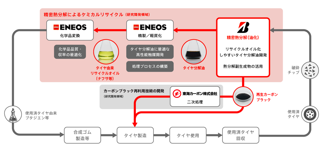 2023年には、東京都小平市のBridgestone Innovation Parkに実証機を導入し、精密熱分解試験を開始。使用済タイヤから分解油や再生カーボンブラックといった生成物を回収する技術開発を、さまざまなパートナーとの共創活動を通じて進めてきました。この基盤技術を基に、今回、関工場内に建設するパイロット実証プラントでは、量産を見据えた技術実証が進められる他、安定した連続運転に必要なプロセス設計や品質管理などの知見の獲得、プラント操業のノウハウ構築に加え、ケミカルリサイクルの実現を支える人財育成、そして使用済タイヤのタイヤチップの輸送・受⼊、生成物の出荷といった社会実装に向けたロジスティクス面の検討も行われる予定です。