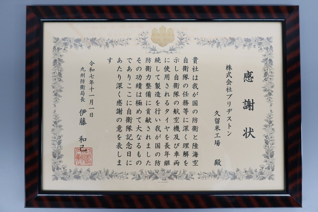 TOP 記事 防衛省 九州防衛局長から感謝状が贈呈されました 防衛省 九州防衛局長から感謝状が贈呈されました 2025.12.12 11月5日、(株)ブリヂストン 久留米工場が、防衛省 九州防衛局長から「感謝状」を贈呈されました。 これは、11月1日の自衛隊記念日にあたり、陸海空自衛隊の任務などを深く理解し、防衛力整備に貢献した企業に対し、防衛省が贈呈するものです。 ブリヂストンは、防衛省が所有する航空機や車両へのタイヤの供給実績と、その高い品質が評価されました。 久留米工場で行われた贈呈式では、「変動の大きいオーダーに対しても、不足なく供給いただいた」「長期にわたり品質トラブルなく、高品質な製品で自衛隊の任務遂行に貢献いただいた」と感謝のコメントを頂きました。 九州防衛局 長崎防衛支局長 佐々木様(中央)より、久留米工場長 杉山さん(右から3番目)へ感謝状が手渡されました アンケートへのご協力をお願いいたします。ご回答内容は今後の記事制作に活用させていただきます。性別(選択してください) 男性 女性 その他年代(選択してください) 10代 20代 30代 40代 50代 60代 70代以上勤務場所(選択してください) 京橋地区(東京スクエアガーデン・ブリヂストンクロスポイント) 小平テクノロジーセンター、BIP 小平B-Trinity 横浜テクノロジーセンター 工場 プルービンググラウンド 支社 小平、横浜以外の研究開発拠点 営業所、タイヤセンター等(B to B向けの拠点) 小売販売店等(B to C向けの拠点) 物流倉庫等 その他お立場(選択してください) 経営層・幹部層(部門長以上) 管理層(部長・課長) IC職・主査・主任部員 開発企画職 事務企画職 監督職(主任・職長) 専門技能職(技能士、保全職など) 技能職(製造など) 医務職 その他 関連タグ: #製造 いいね!(0) みんなからのコメント待ってるよ! コメントする ※「コメントする」を押してもすぐにはコメントは反映されません。 管理者にて確認の上、反映されます。コメント掲載基準については こちら をご覧ください。 尚、投稿者につきましては、管理者でも特定できない仕様になっております。 コメント(1) SAGAさん 2025/12/15 15:30 築城基地の航空祭に毎年のように参加させていただいています、そこでF-15イーグルたF2、T4などの航空機や自衛隊の車(ジープ)などが、ブリヂストン製と紹介されていて誇りに思ったことを思い出しました。今後も採用されていくよう「最高の品質で社会に貢献」に携われるようにしていきます。 いいね!(0) 返信する S耐から広がるサステナビリティ サステナブルな挑戦と凄腕従業員ドライバー お客さんを乗せて「AirFree」が走る! 社会実装に向けた大きな一歩