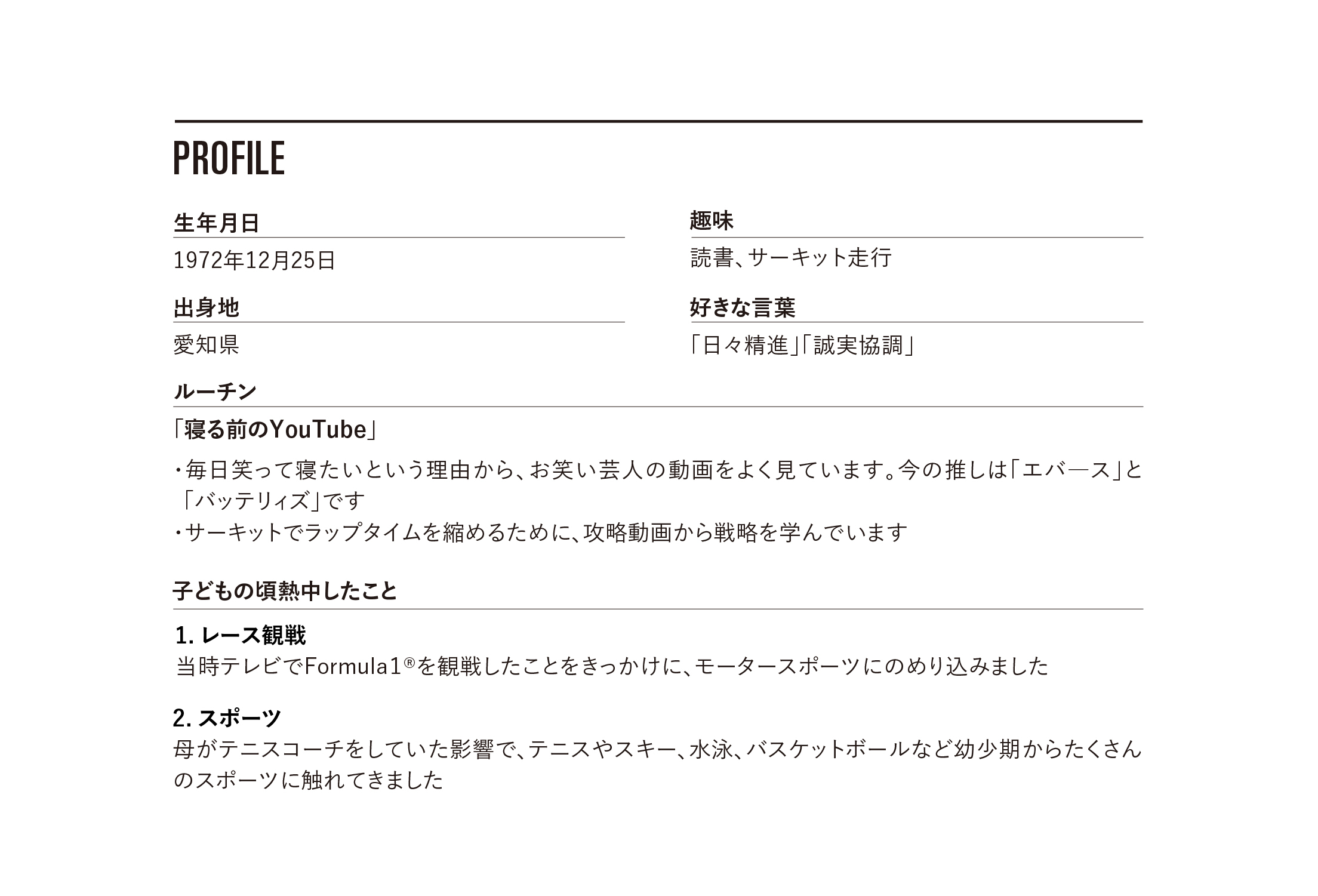 私の原点には、子どもの頃から抱いていたレーサーへの憧れがあります。小学生の時、テレビでレースを見るのが好きで、将来の夢はレーサーになることでした。その後もレーサーへの夢は変わらず、いずれはレーシングカートを始めるつもりでいましたが、16歳になり高校進学を控えていた頃、父がアメリカに転勤することに。当初は日本に残る予定でしたが「アメリカは16歳で免許が取れる」という兄の一言に心が動かされました。英語が話せないことや日本を離れる不安よりも、16歳でマニュアル車を運転できる魅力が完全に勝り、アメリカの高校に転校することを決意しました。単身赴任の予定が急きょ変更になったので、両親はきっと大変だったと思います。