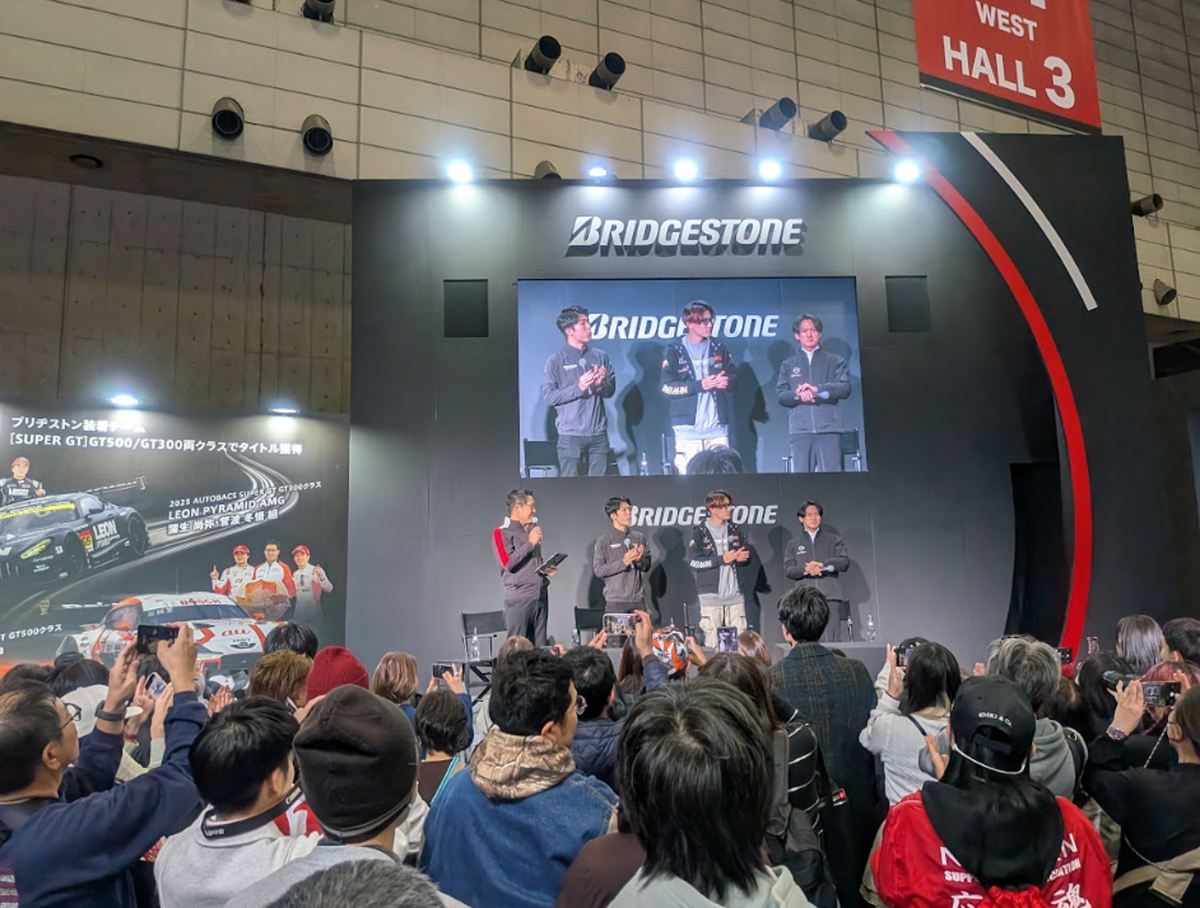 「POTENZA」の進化を語る上で欠かせないのがモータースポーツ活動。「From Circuit to Street」の考えのもと、レースで培われてきた技術が、これまでの市販「POTENZA」商品に搭載されています。ブースでは、2025年スーパーGTのGT300シリーズでチャンピオンを獲得したLEON PYRAMID AMGの車両が展示されました。存在感のある大きなエアロパーツ、チャンピオンの名にふさわしいAMG GT3の堂々たる姿に多くのお客様が目を奪われていました。また、K2R&D LEON RACINGを招いたトークショーでは、チャンピオン獲得の瞬間の裏話もあり、ステージは大いに盛り上がりを見せました。他にも現役GT500シリーズのドライバーやレジェンドドライバー、GR86/BRZ Cupのドライバーを招いたステージも実施。連日多くのお客様がブースに集まり、賑わいを見せていました。