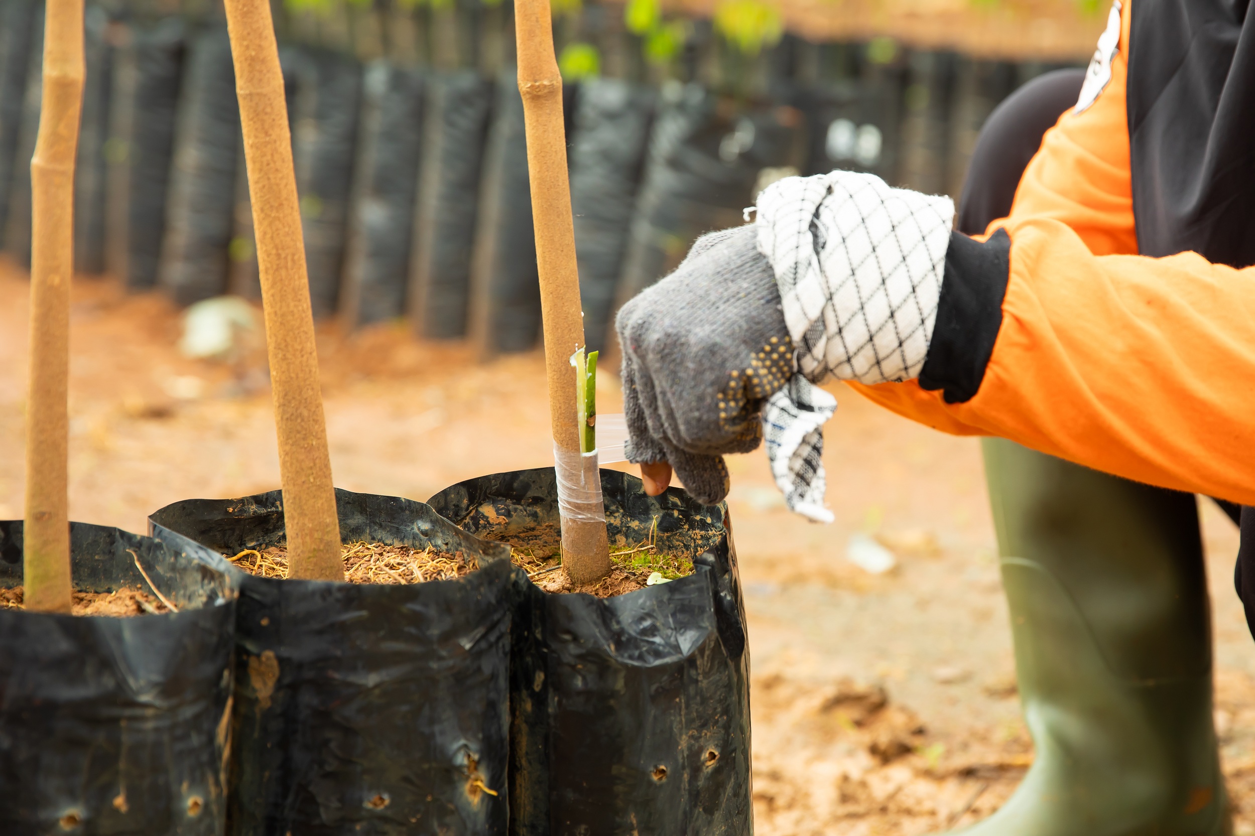 パラゴムノキの育成は、単に種を植えて育てるというものではありません。まず種を植え、その種から育った「台木の苗」と、品種を選定した「芽接ぎ用の苗」を組み合わせます(芽接ぎ作業)。その際、台木側の芽を切り落とすことで、養分は接いだ芽に向かい、選定した品種の芽が成長を始め、必要な品種の苗を準備できます。この工程は1人あたり約600本/日行い、この芽接ぎした苗を一定水準まで育成し、植樹していきます。