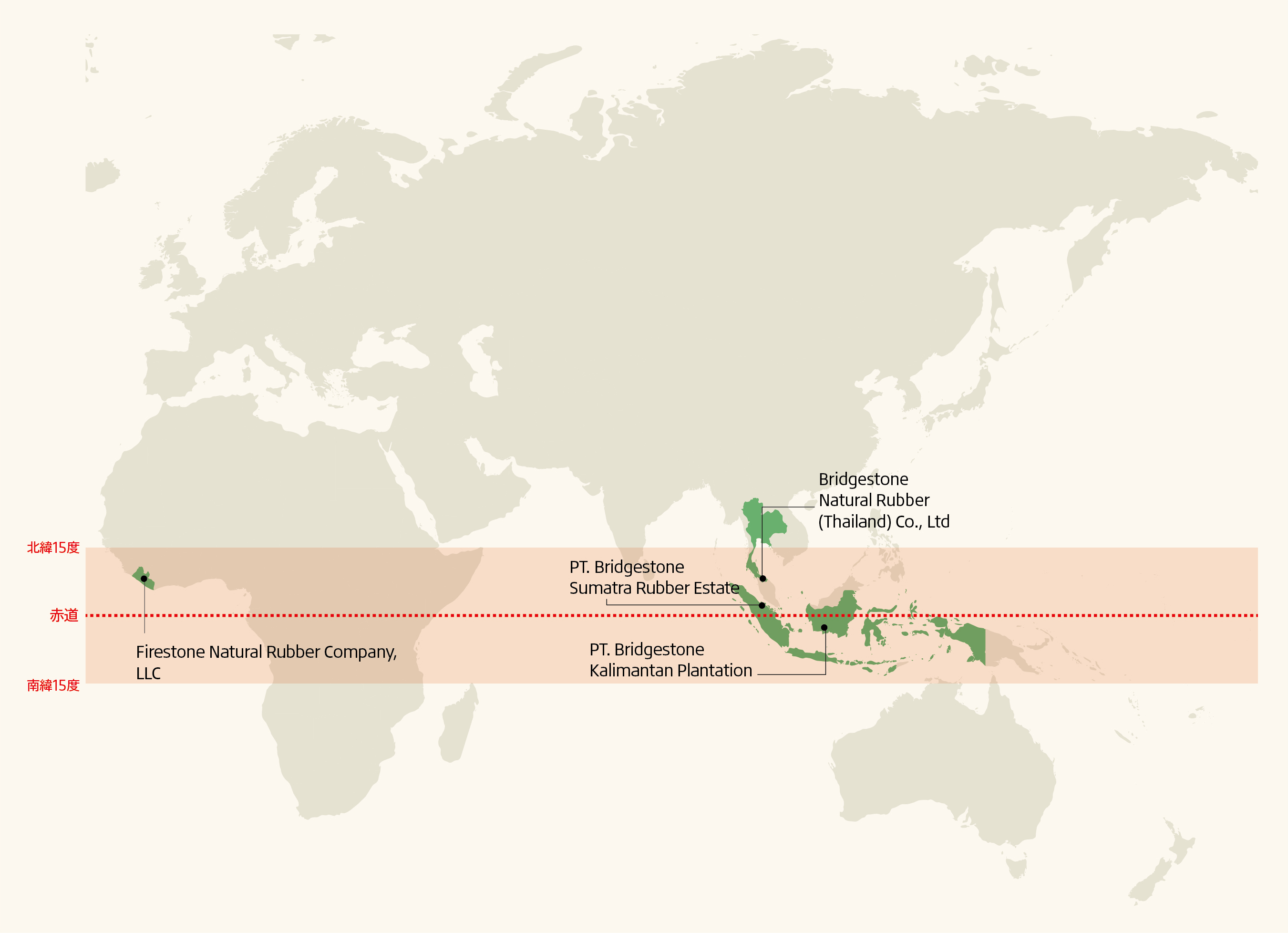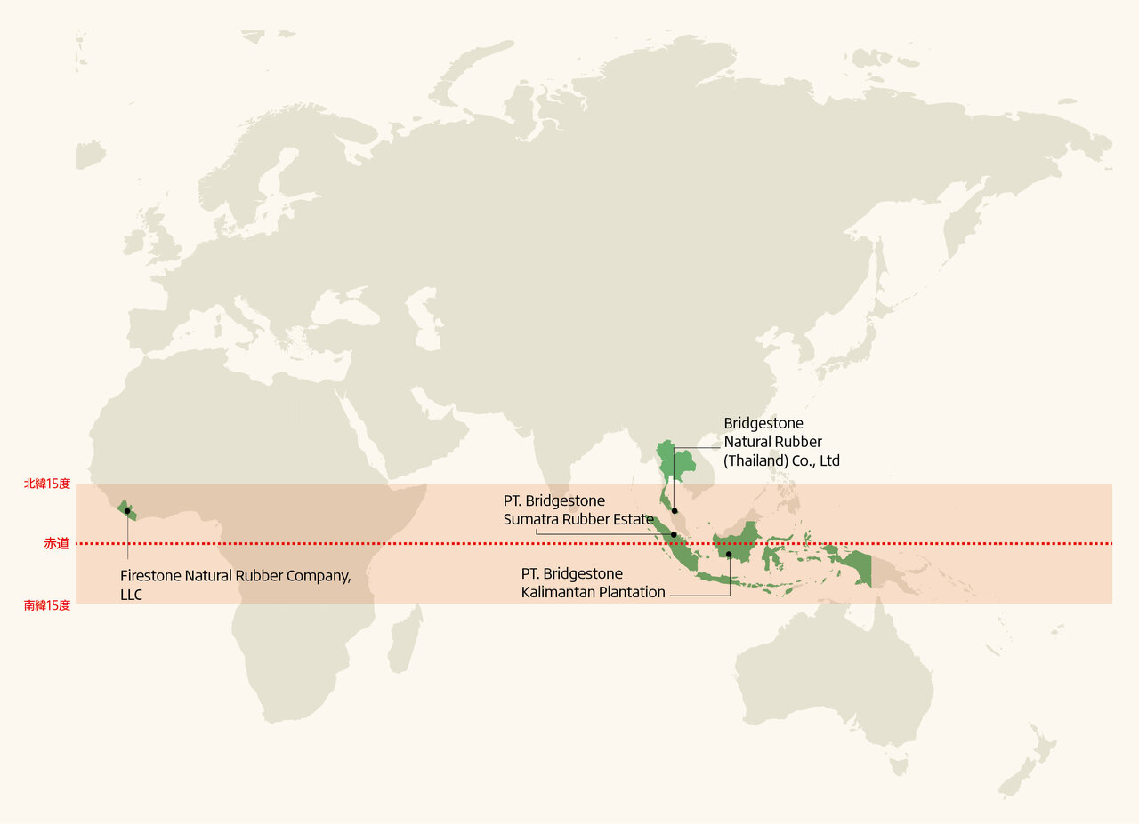 他にもリベリア・ハーベルにあるFirestone Natural Rubber Company, LLC(FSNR)で農園を保有しており、タイ・ソンクラー県にある天然ゴム加工工場のBridgestone Natural Rubber(Thailand) Co., Ltd.(BSNR)と合わせ、4つの拠点で天然ゴムの生産を行っています。