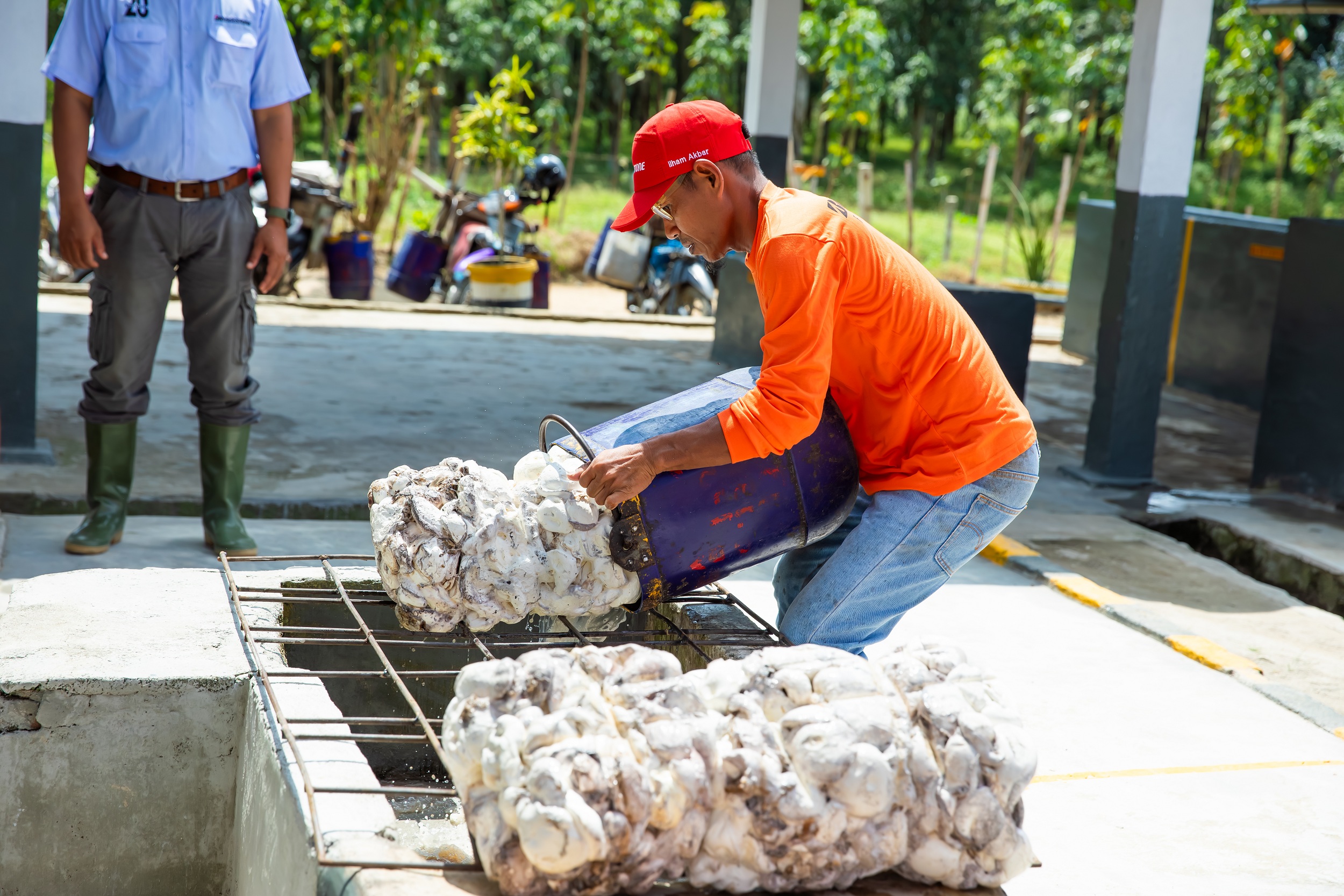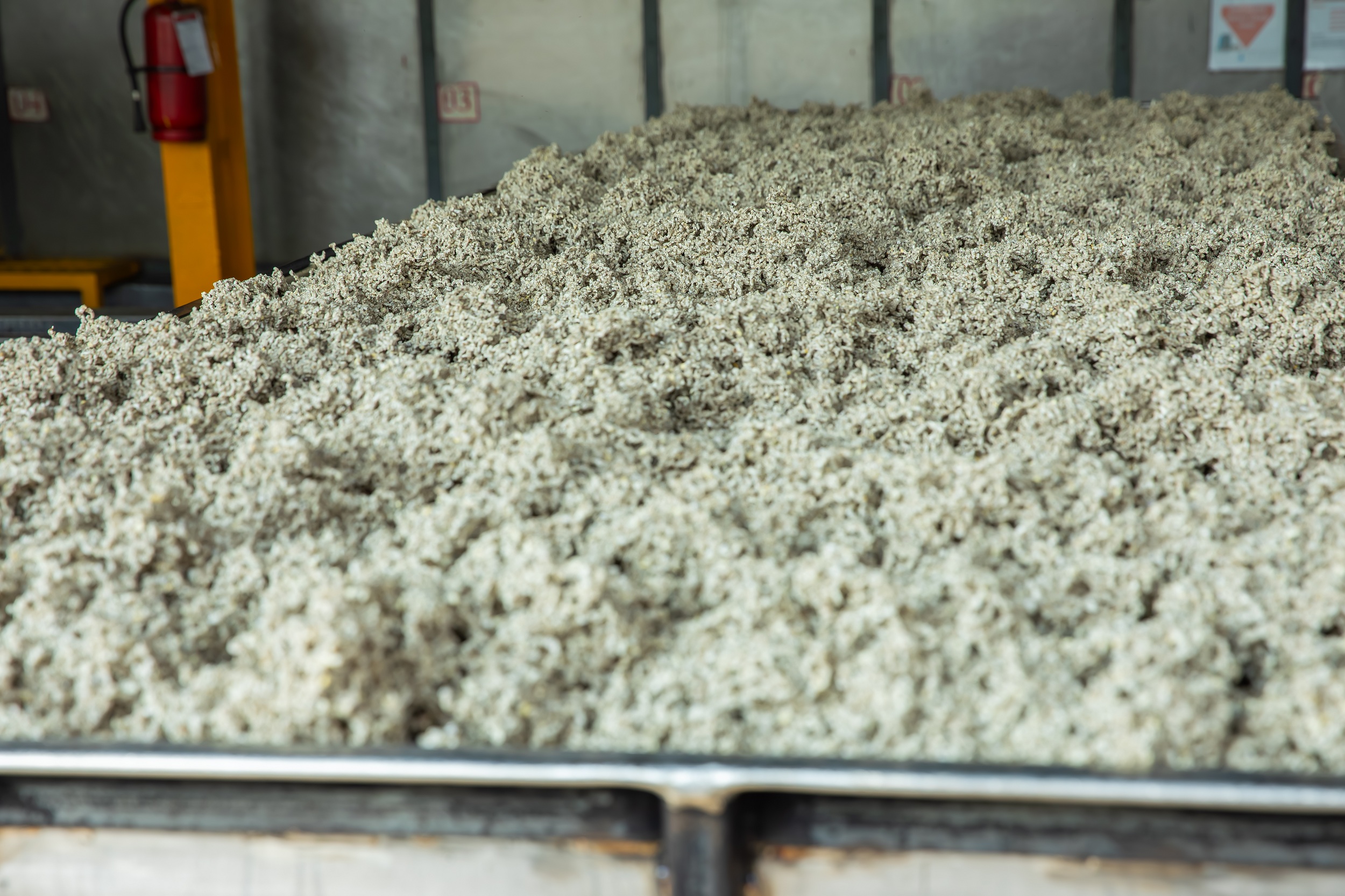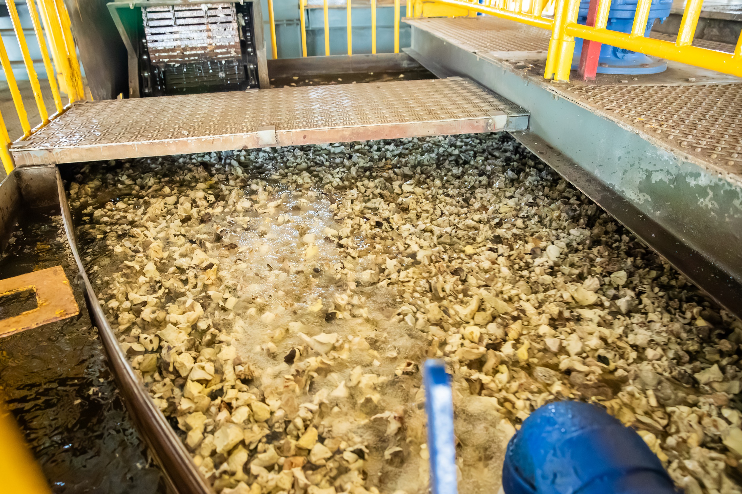工場に運ばれたカップランプは、水流を利用して何度も繰り返し洗浄・粉砕され、内部の泥や異物まで徹底的に洗い流された後、高温で乾燥され、ゴム成分だけが残ります。