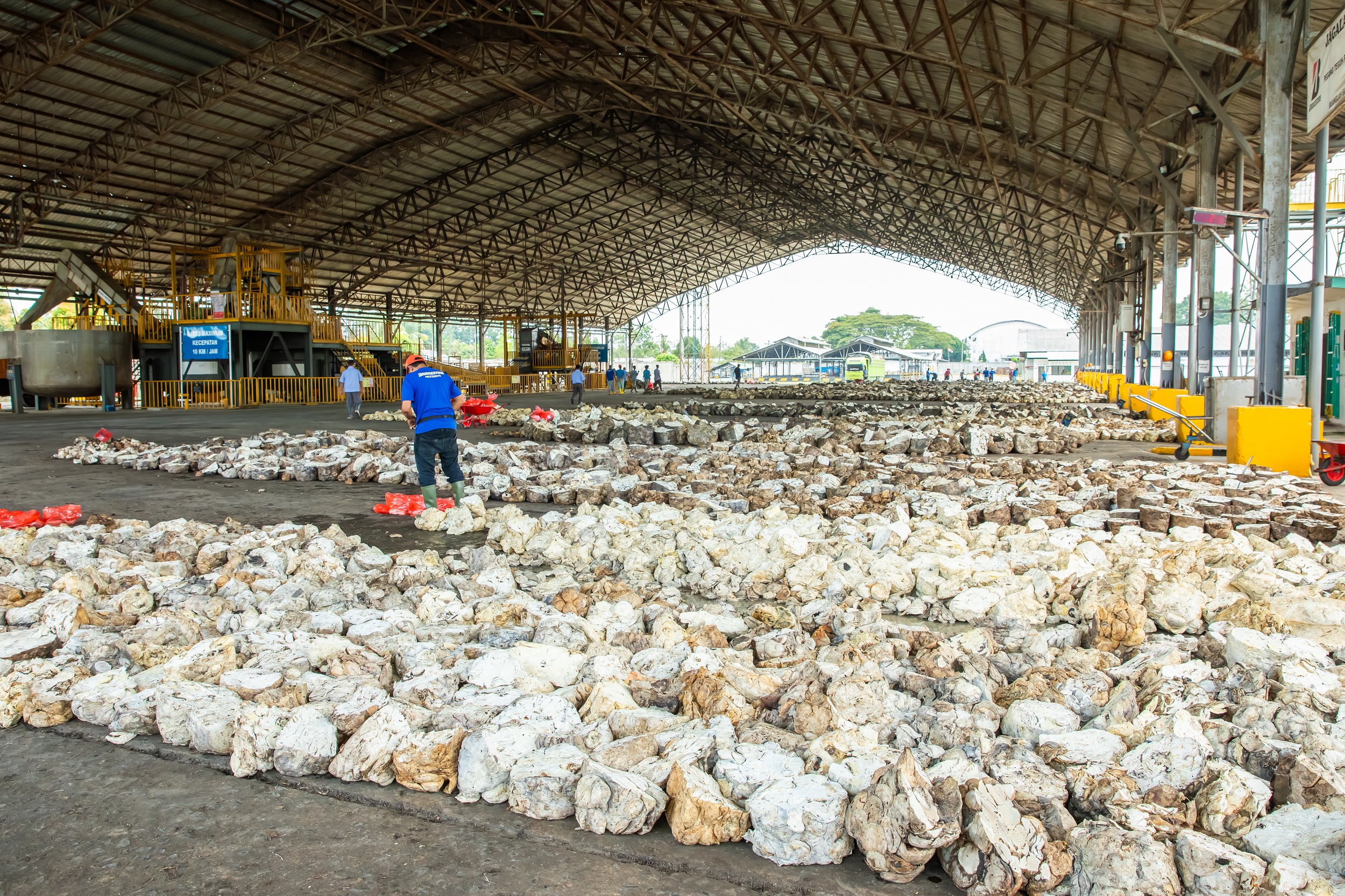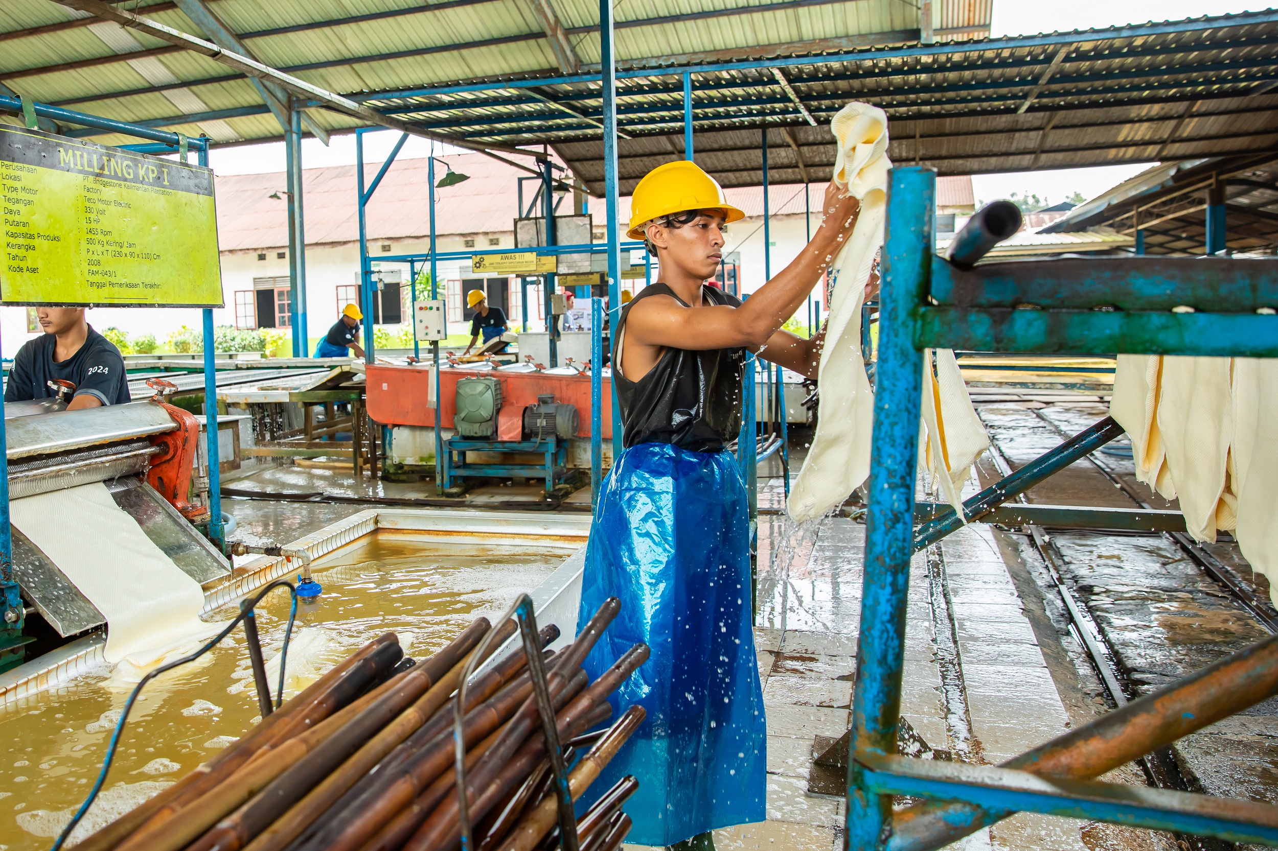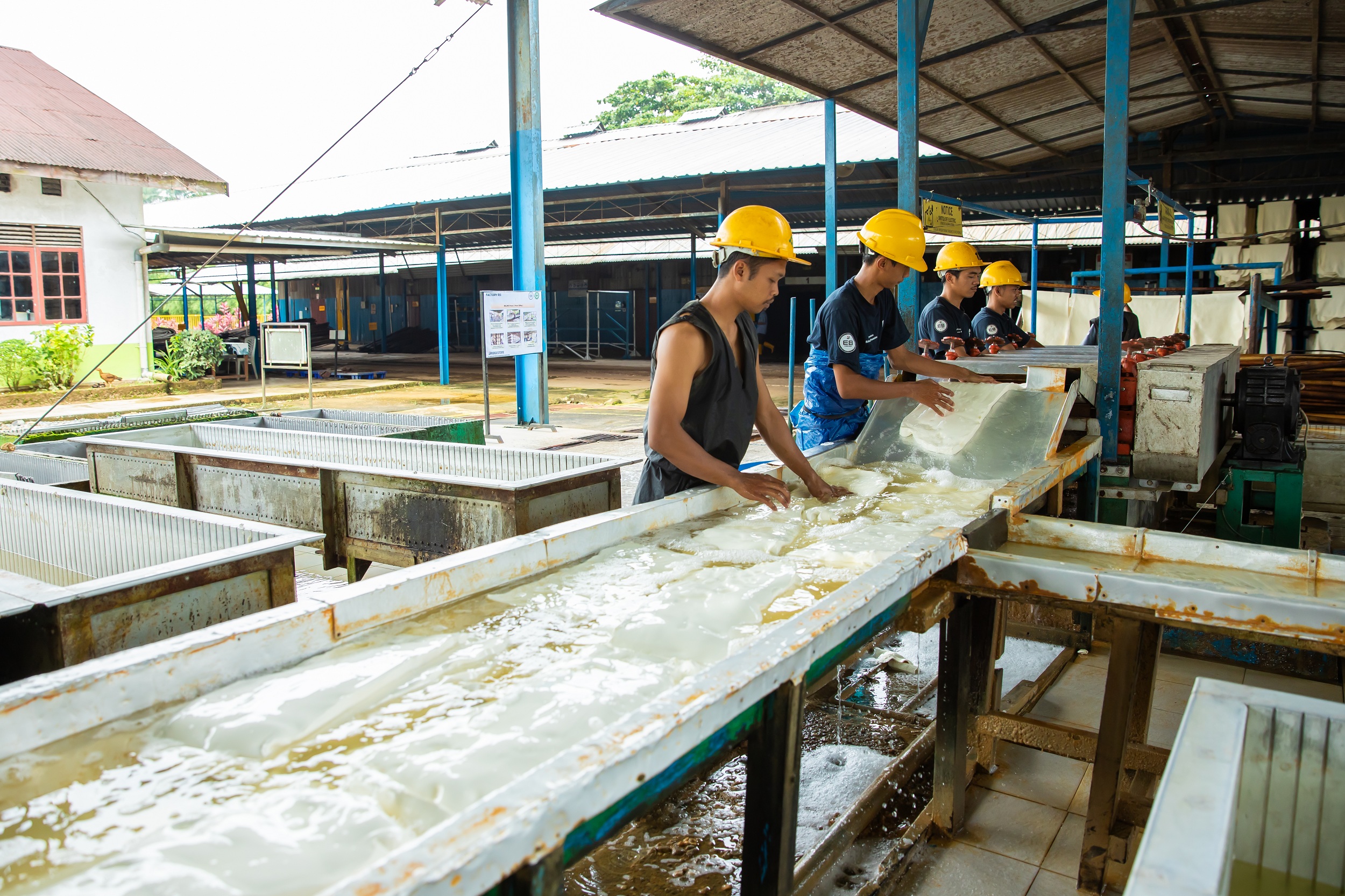 農園でラテックスを凝固した「カップランプ」と呼ばれるものが、主原料として収集され、集積場で異物の量などでランク付けられます。その後、洗浄・粉砕工程へと進んでいきます。