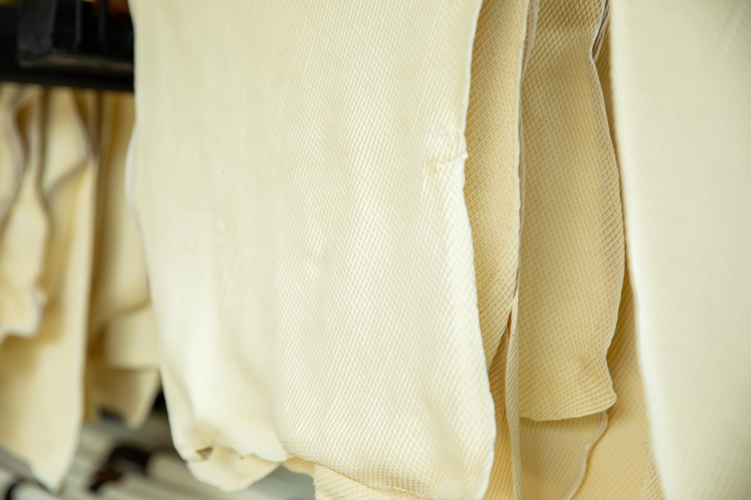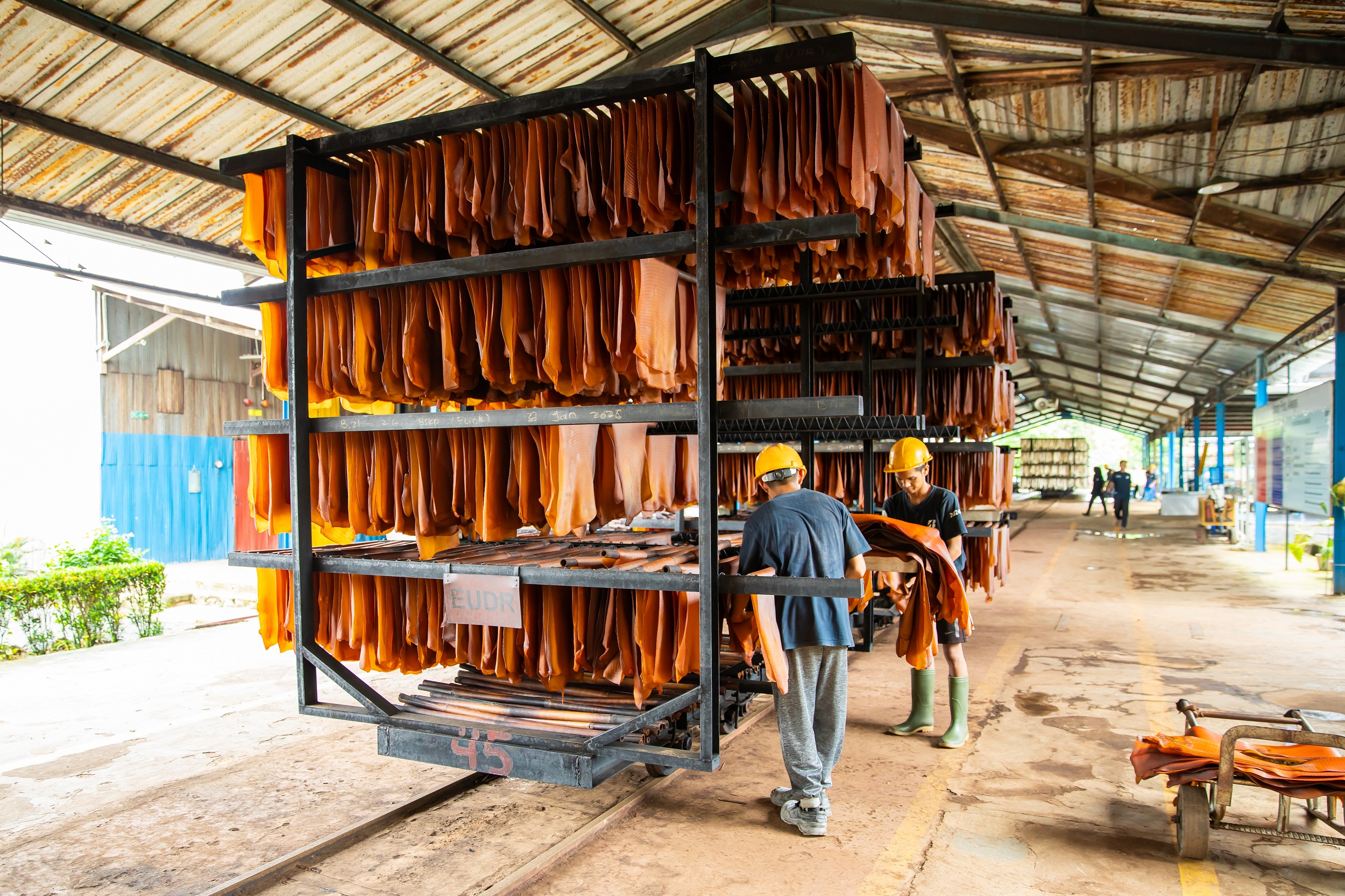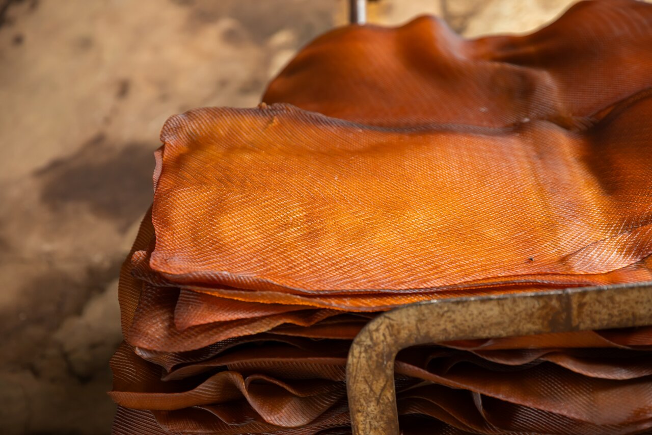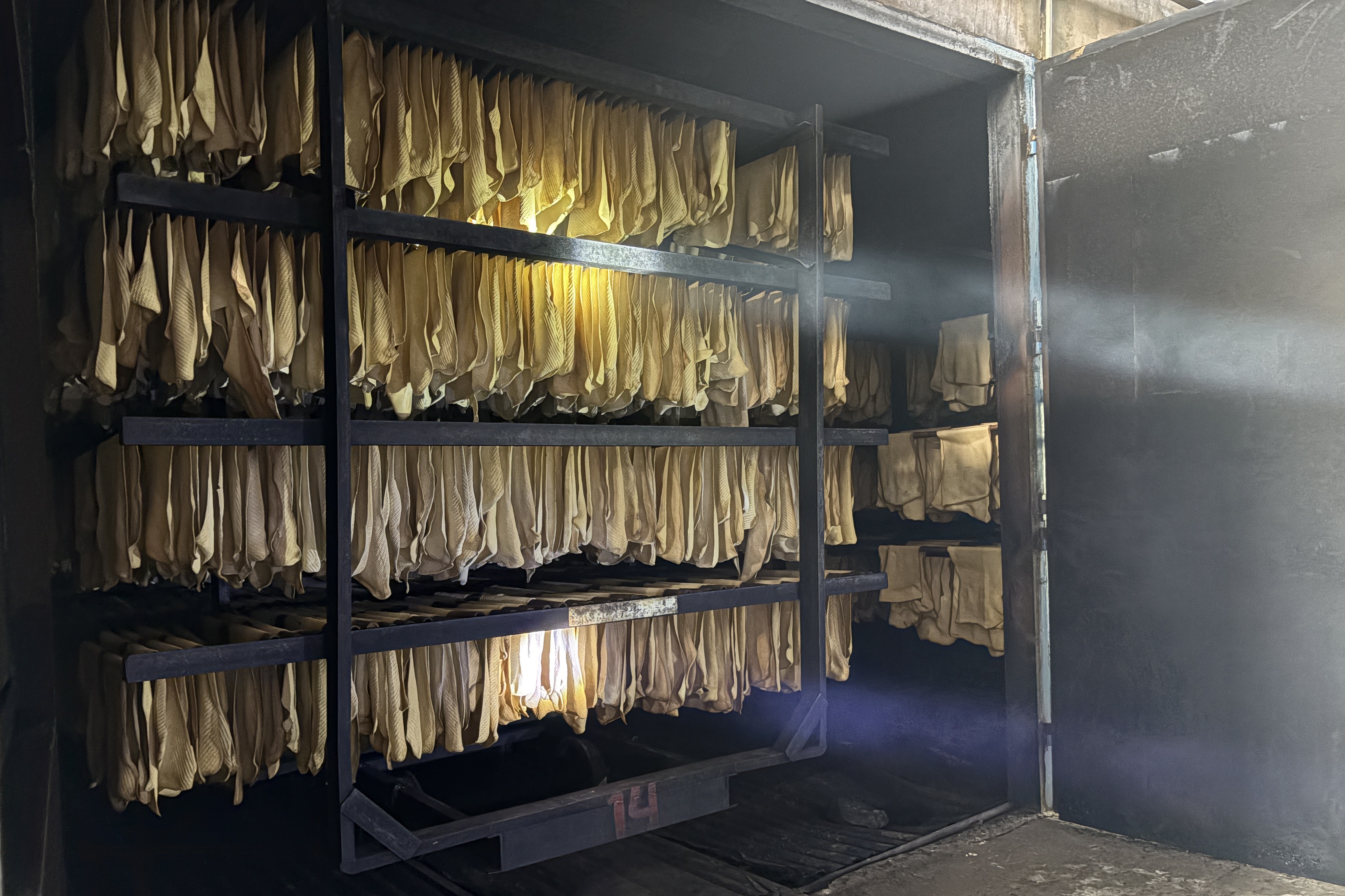 シートは竹竿やハンガーに1枚ずつ吊るされ、燻製室へと移されます。数日間燻煙することで、水分を除去すると同時に、煙による殺菌・防腐効果が加わります。燻製を終えたシートは、厳格な検査を経て、圧縮・梱包され、出荷されます。