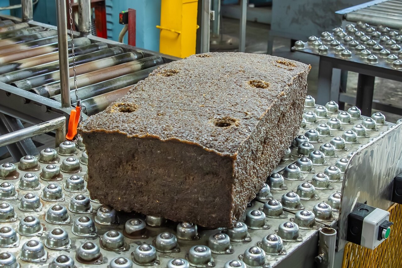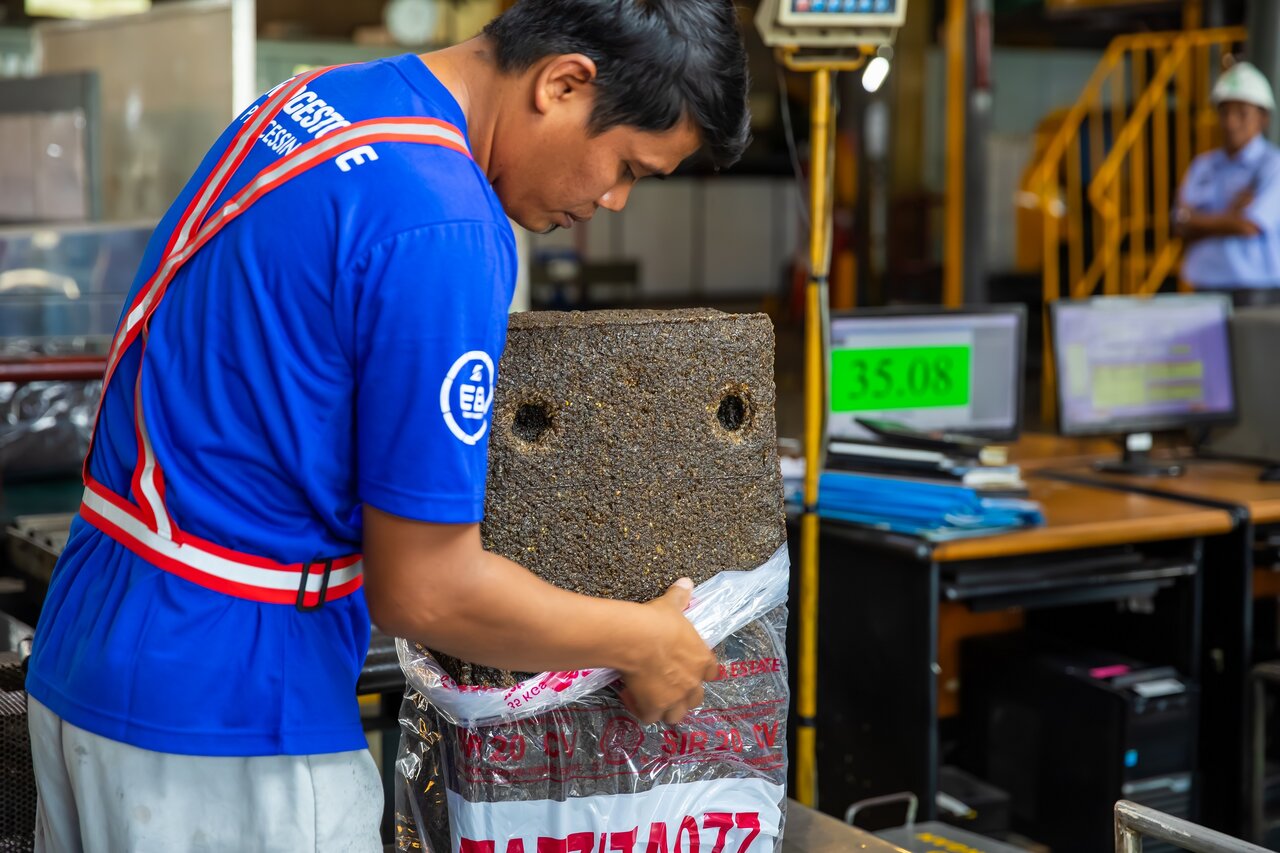 乾燥を終えたゴムはプレス機で圧縮後、ブロック状に梱包され、出荷されていきます。