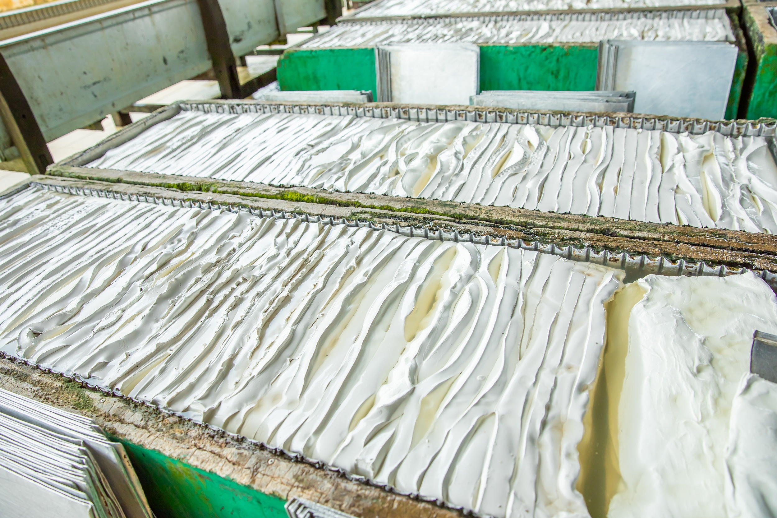 凝固したゴムはローラーに通され、水分を絞りながら薄く延ばされます。ローラーには溝が刻まれており、シート表面にリブ(溝)が形成されます。これにより表面積が増えて乾燥効率が高まるのです。