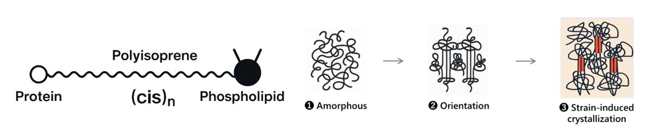 藤野さん 角田さんの言うとおり、天然ゴムが使われ続けている一番の理由は、高い耐久性です。その源になっているのが、「伸長結晶性」と呼ばれる性質。ゴムを引っ張ると、内部の分子が自然に整列して、結晶状態をつくります。引っ張られてある歪(ひずみ)に到達すると、ゴムそのものが強くなるということです。これが、裂けにくさや高い耐久性につながっています。